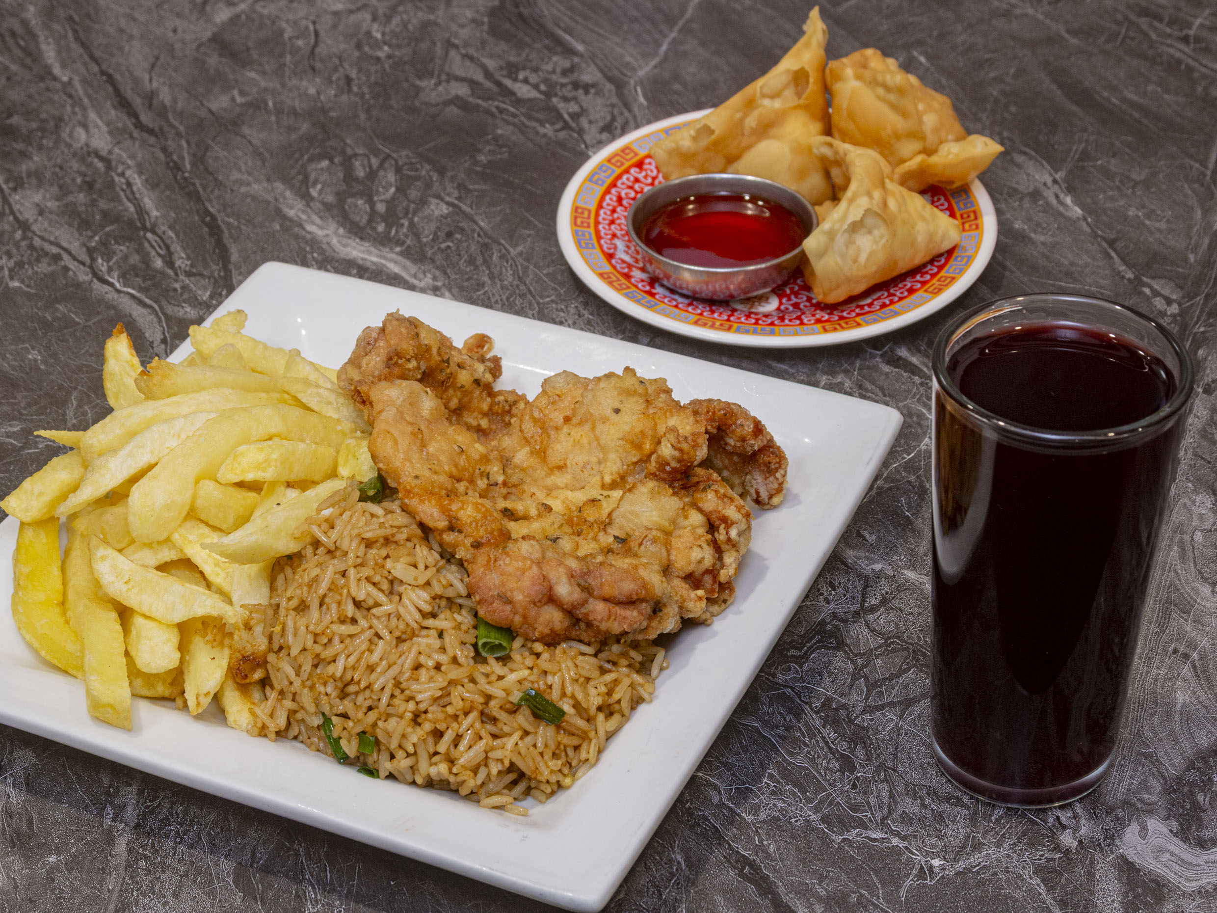 Chicharrón de Pollo +Chaufa +Wantan Frito+ Chicha