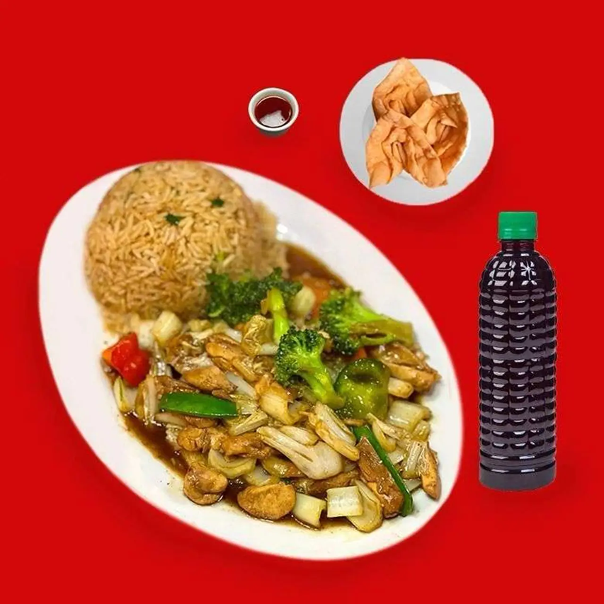 Pollo con verduras + Chaufa + 3 Wantan + Chicha