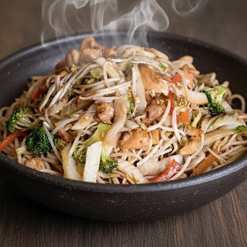 Disfruta de nuestro Tallarín Saltado de Pollo estilo Chifa, preparado al wok con salsa de soya ahumada. Incluye pollo tierno y una mezcla fresca de brócoli, holantao, frijolito chino y pimentón crujiente. ¡Sabor peruano-chino que no te puedes perder!