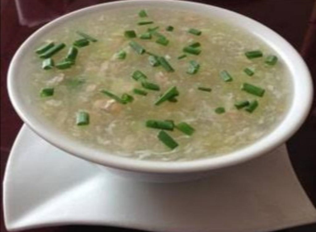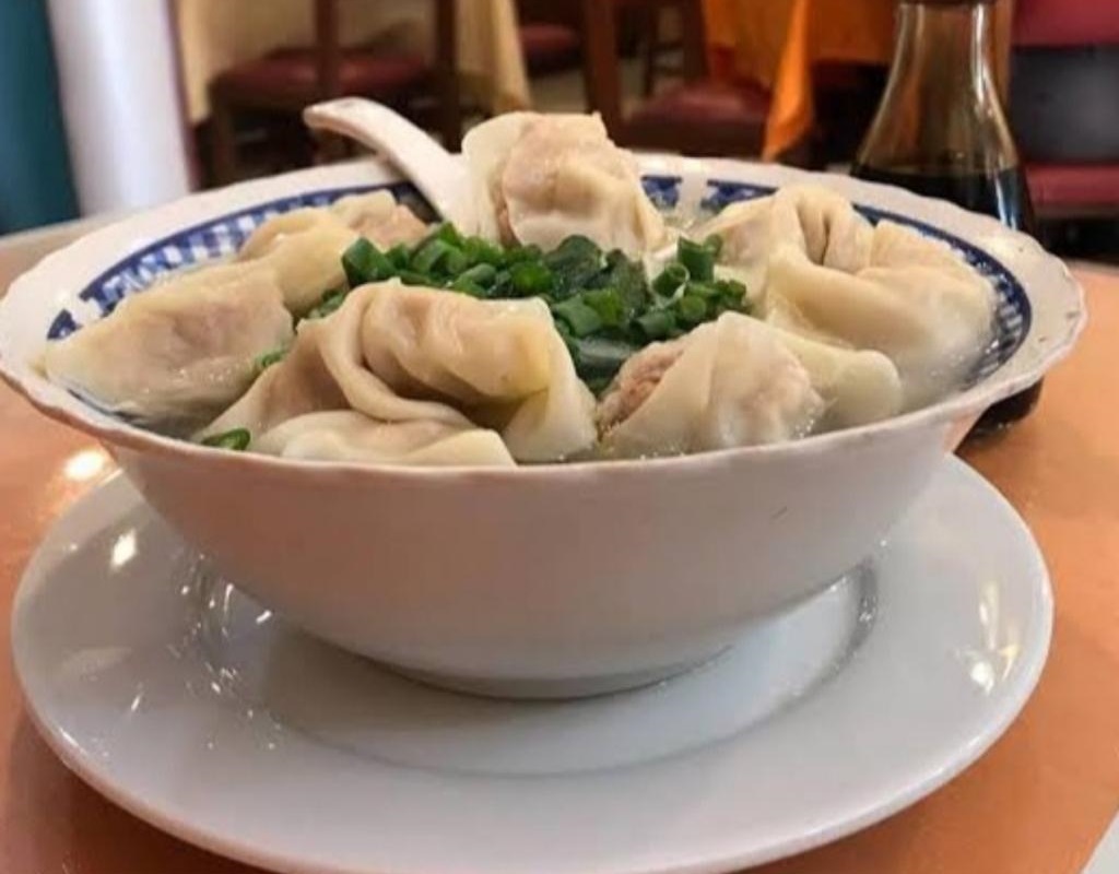 Caldo de pollo, pollo picado, cerdo, pasta wantan y col china.