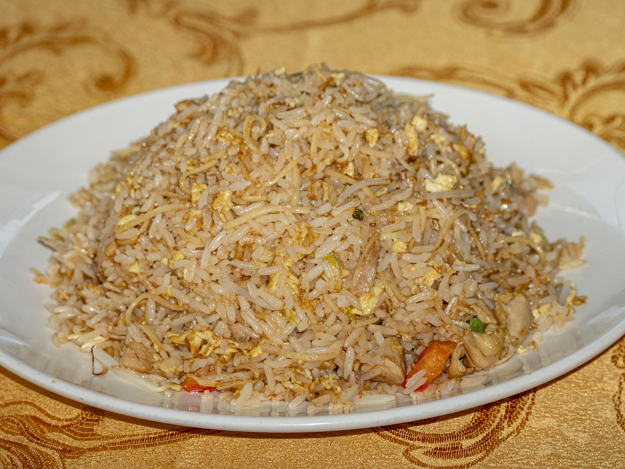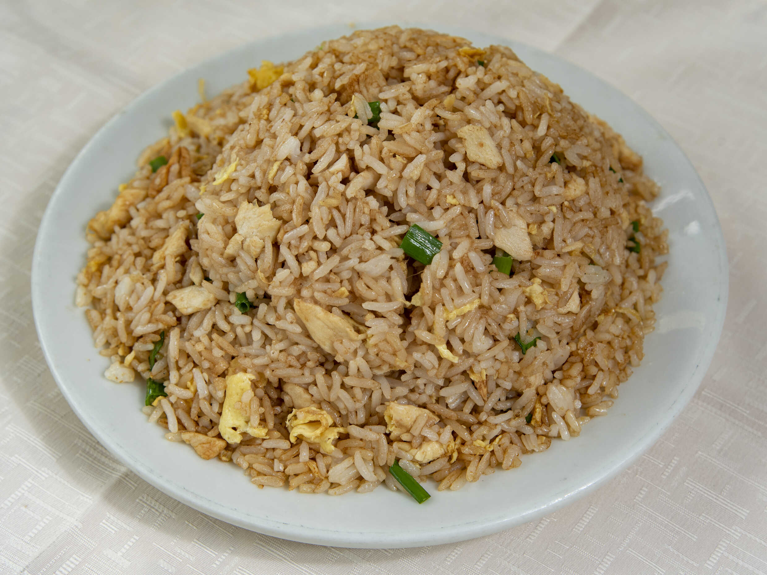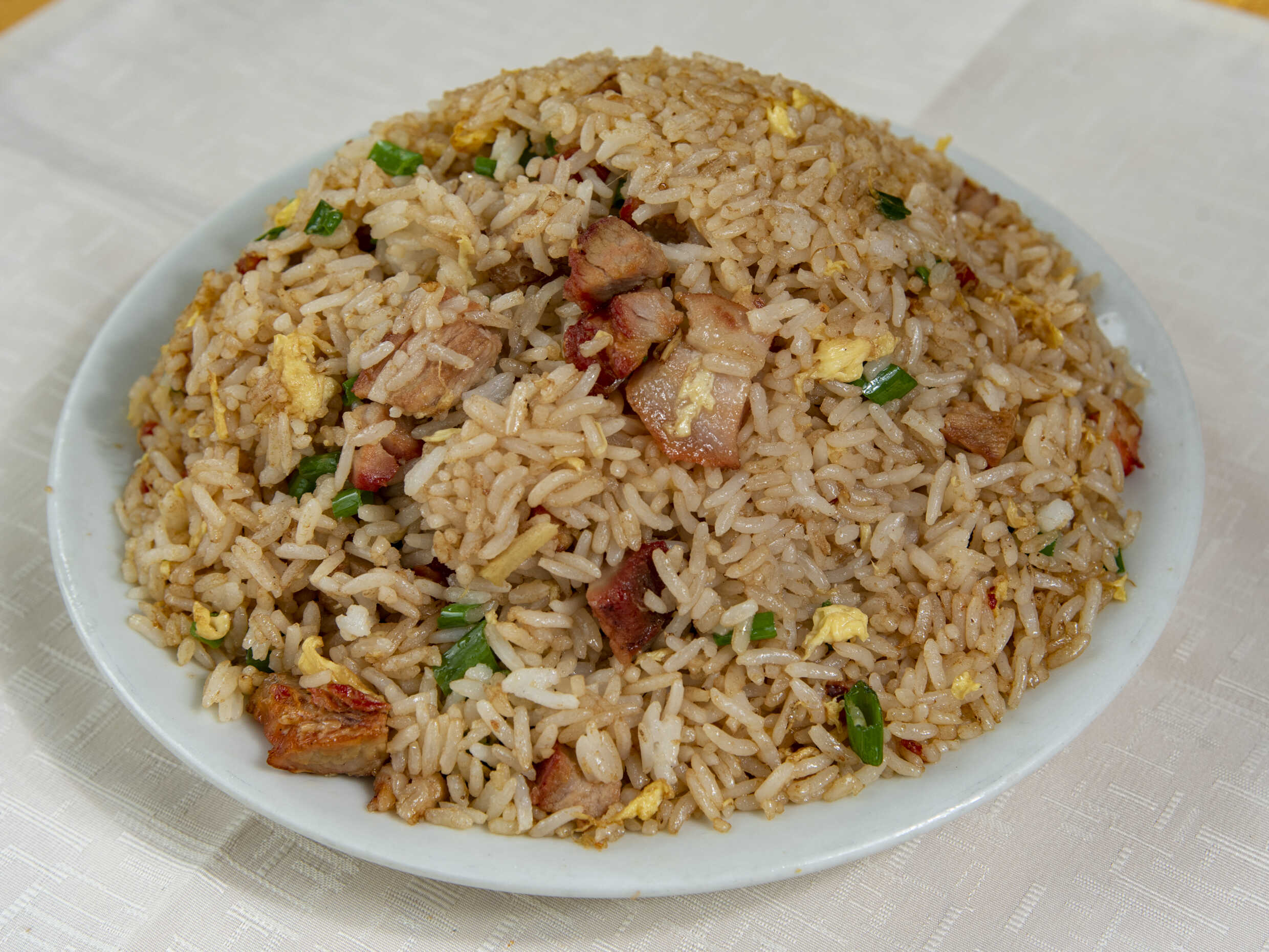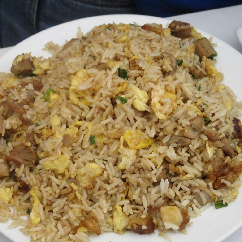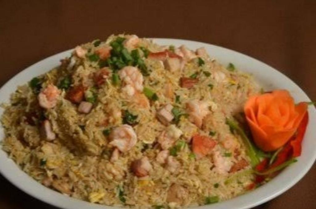 Chancho asado, langostinos, pollo, huevo y cebolla china al wok.