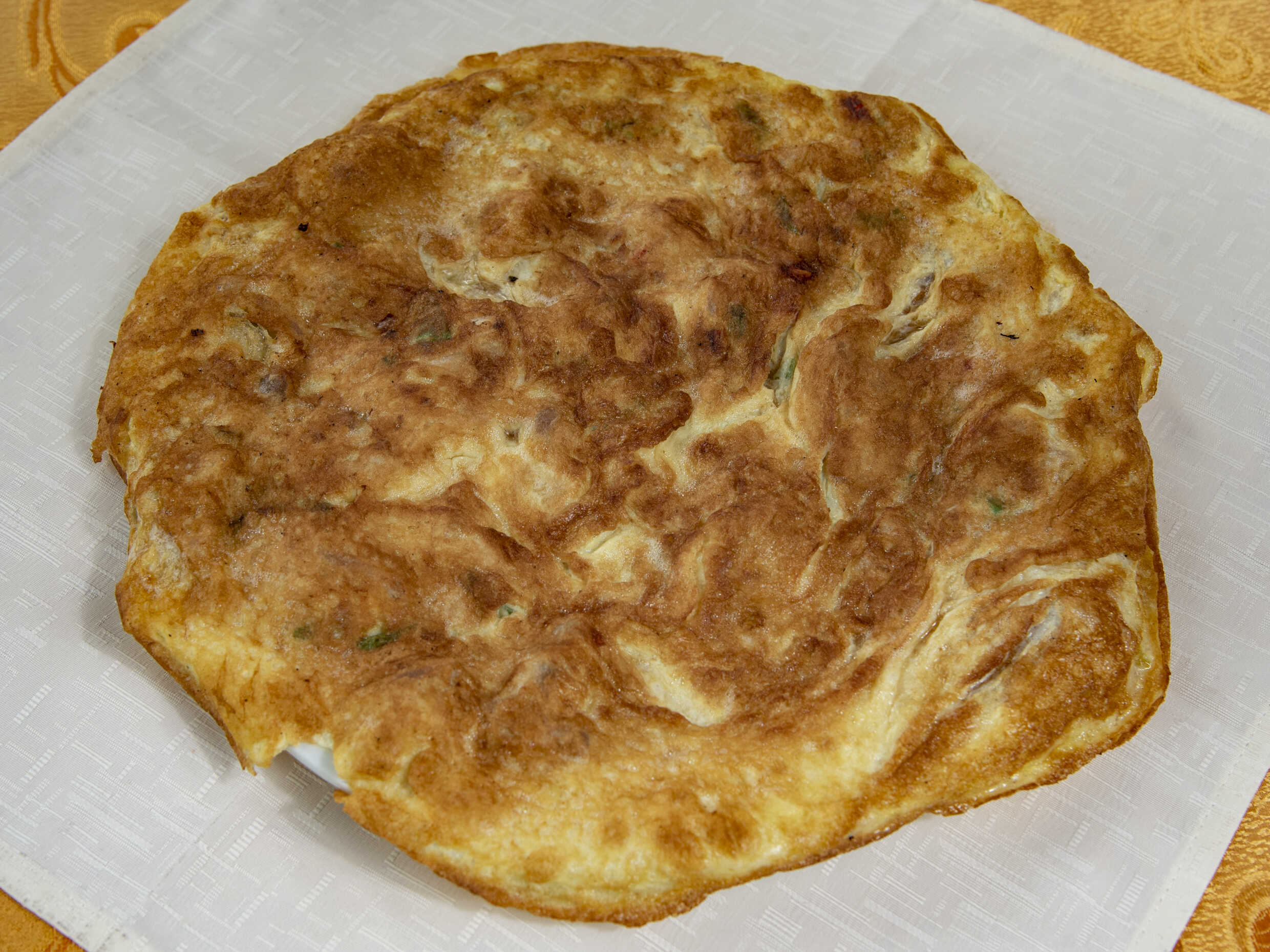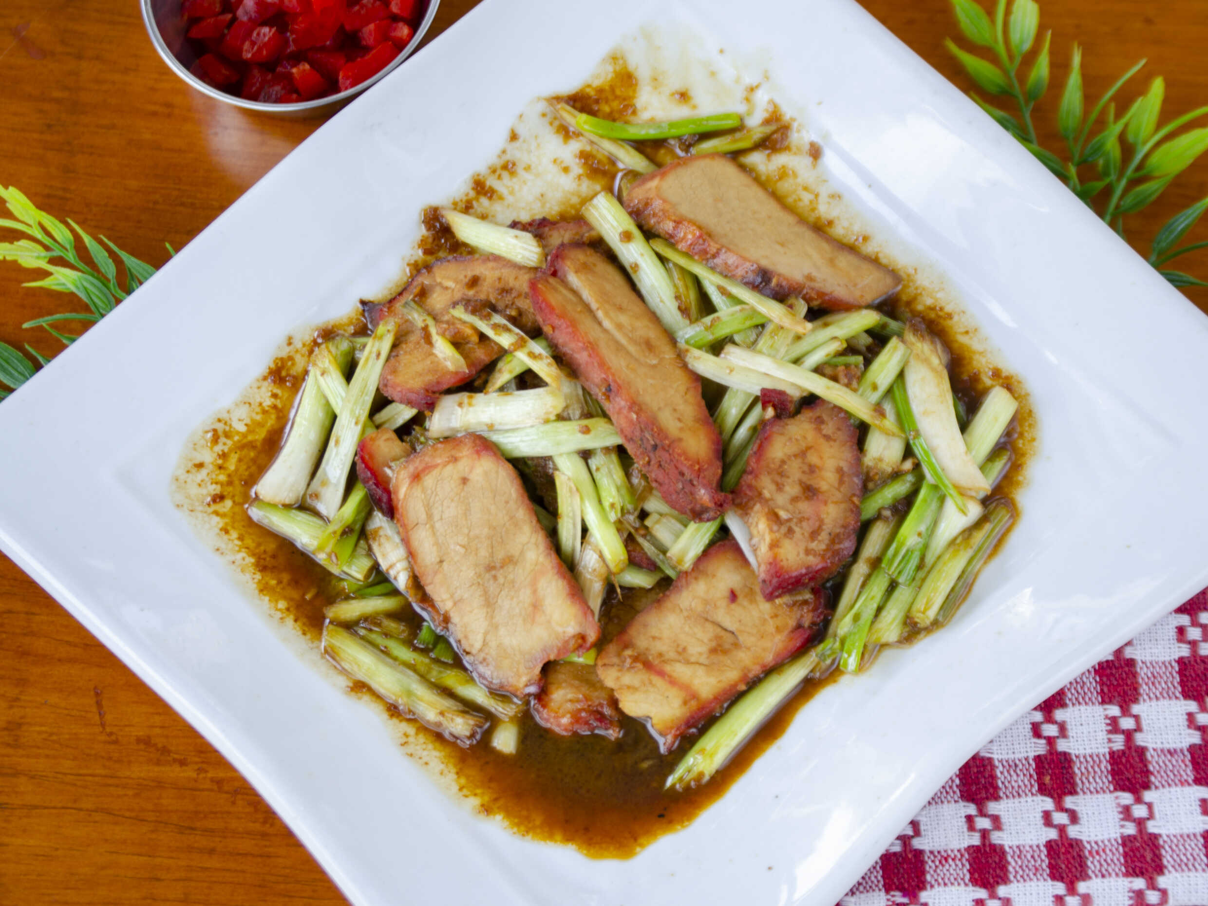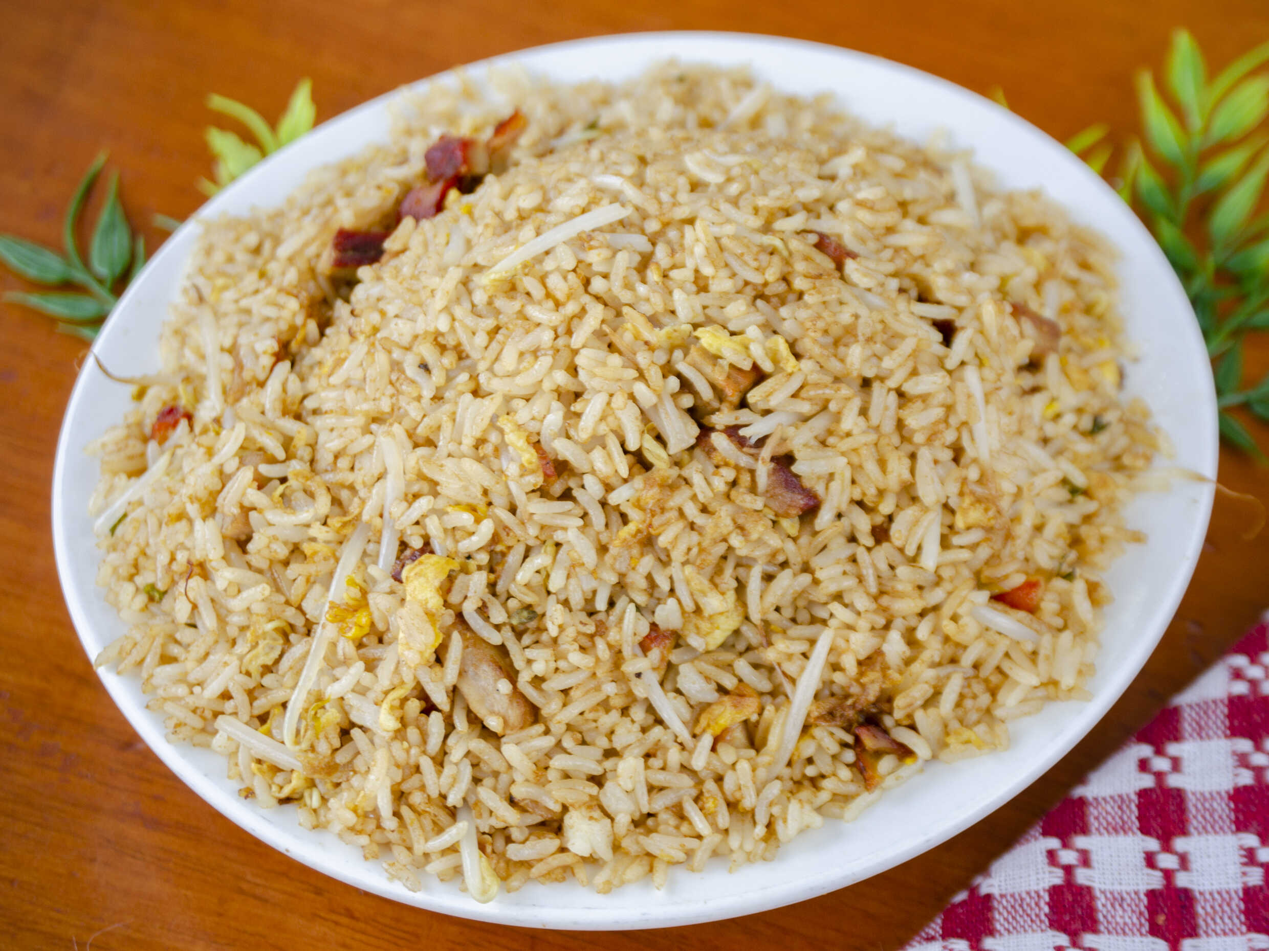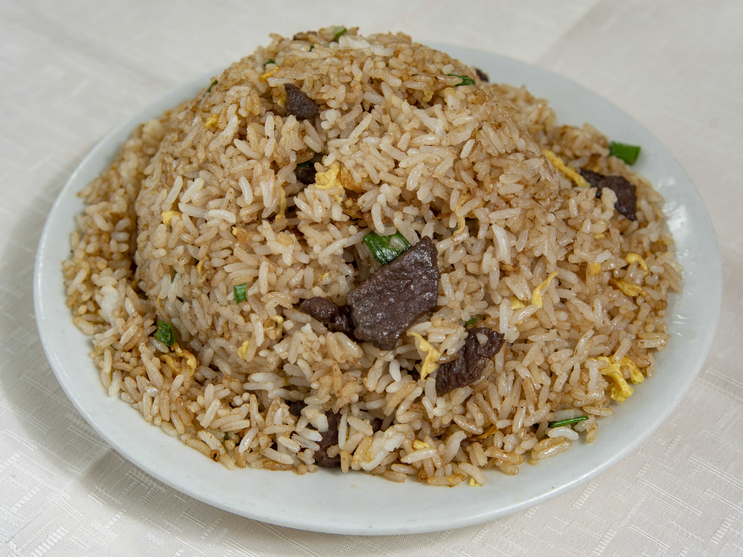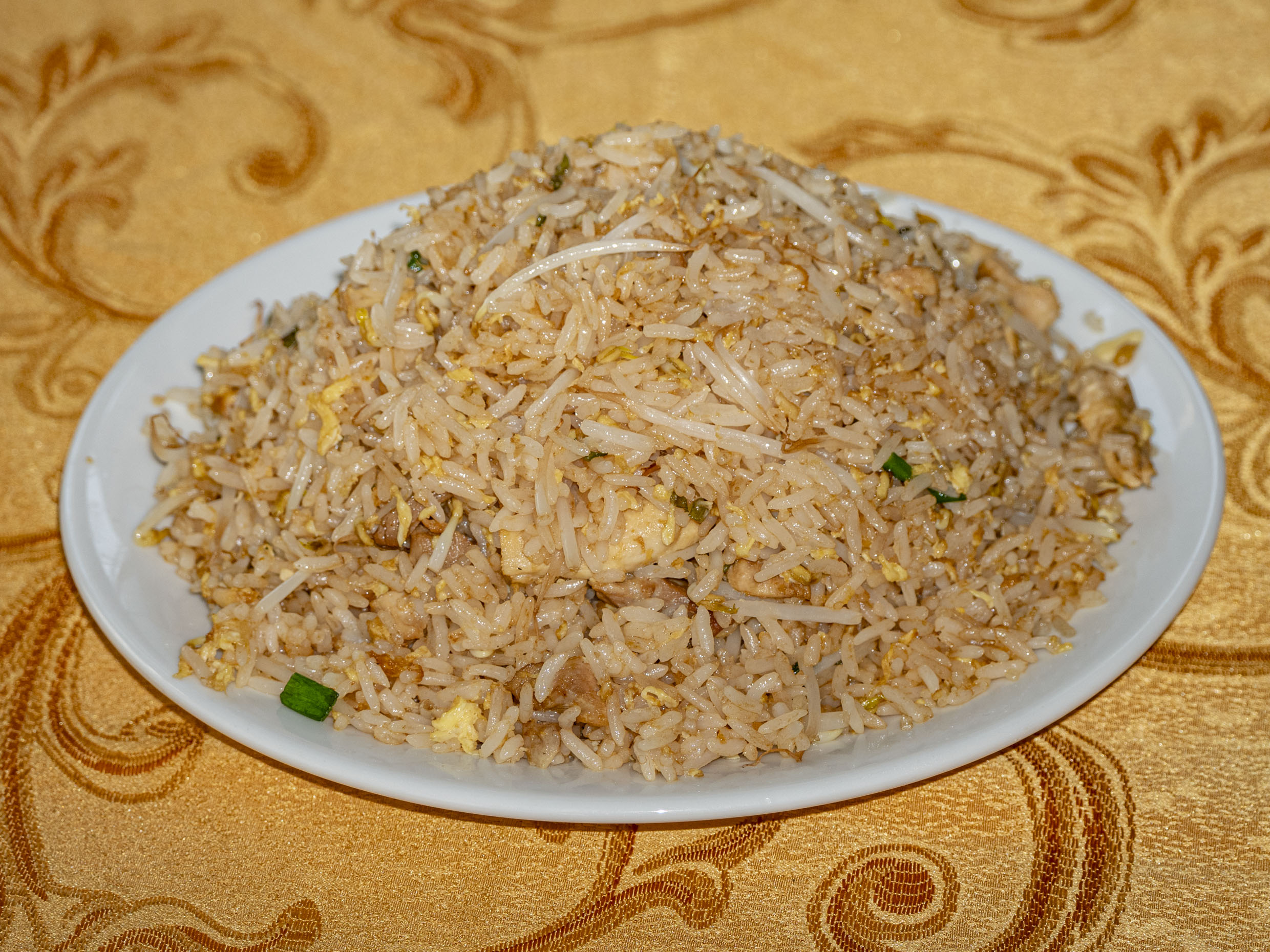 Chancho asado, langostinos, pollo, huevo y cebolla china al wok.