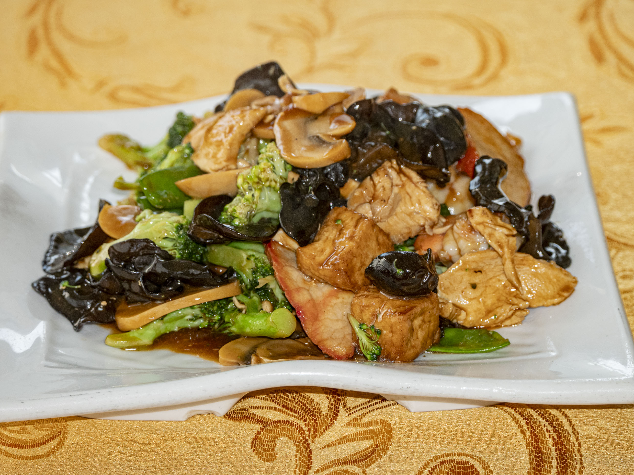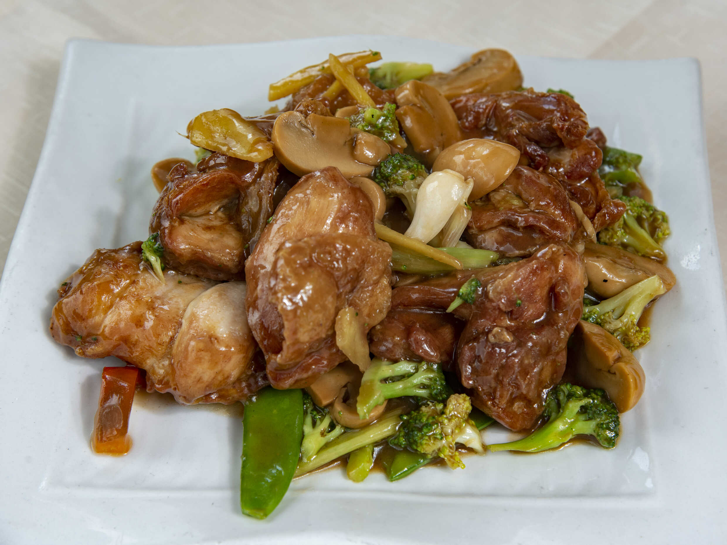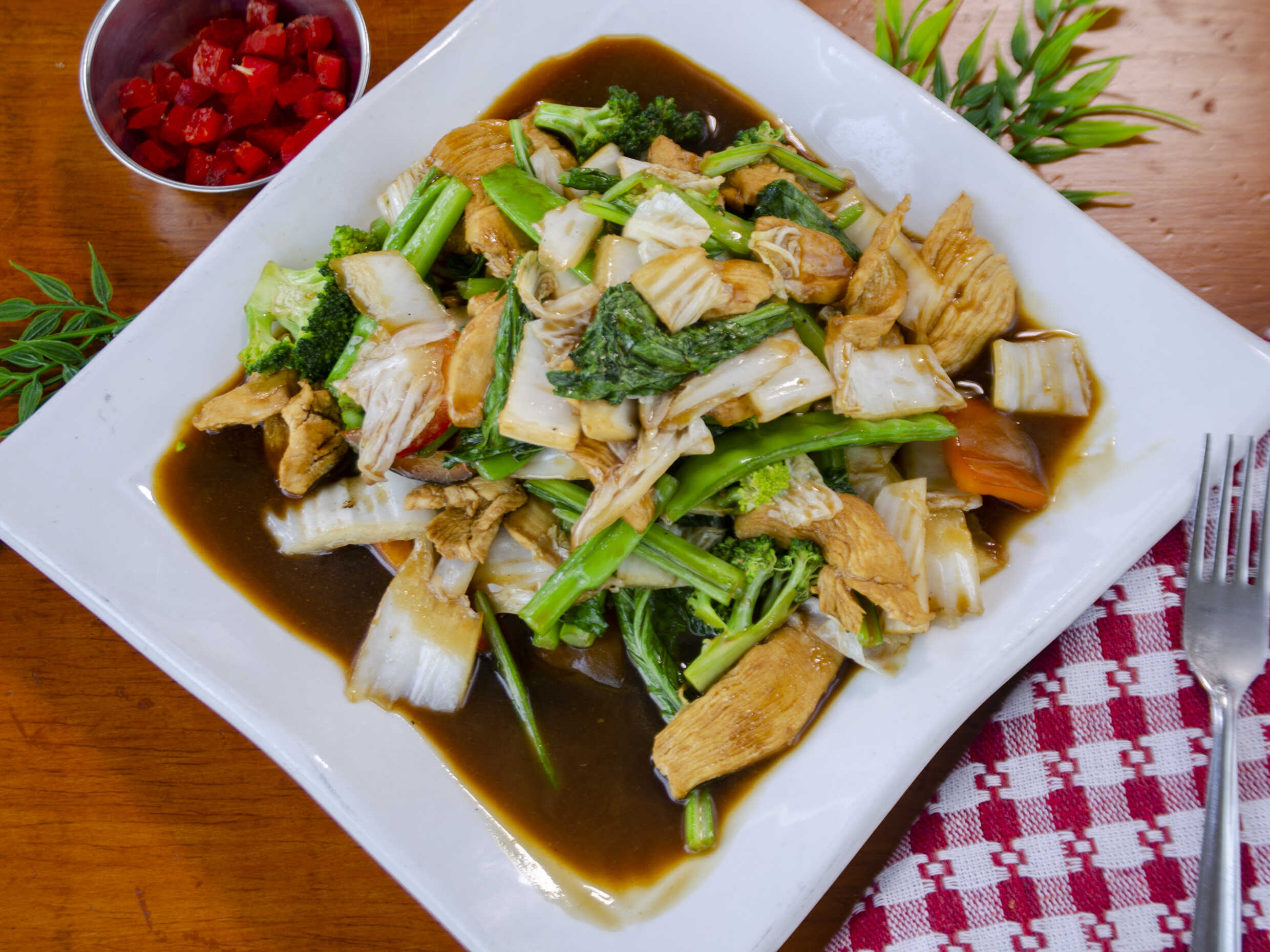 Pechuga picada, brócoli, pimentón, holantao, col china y choysan.