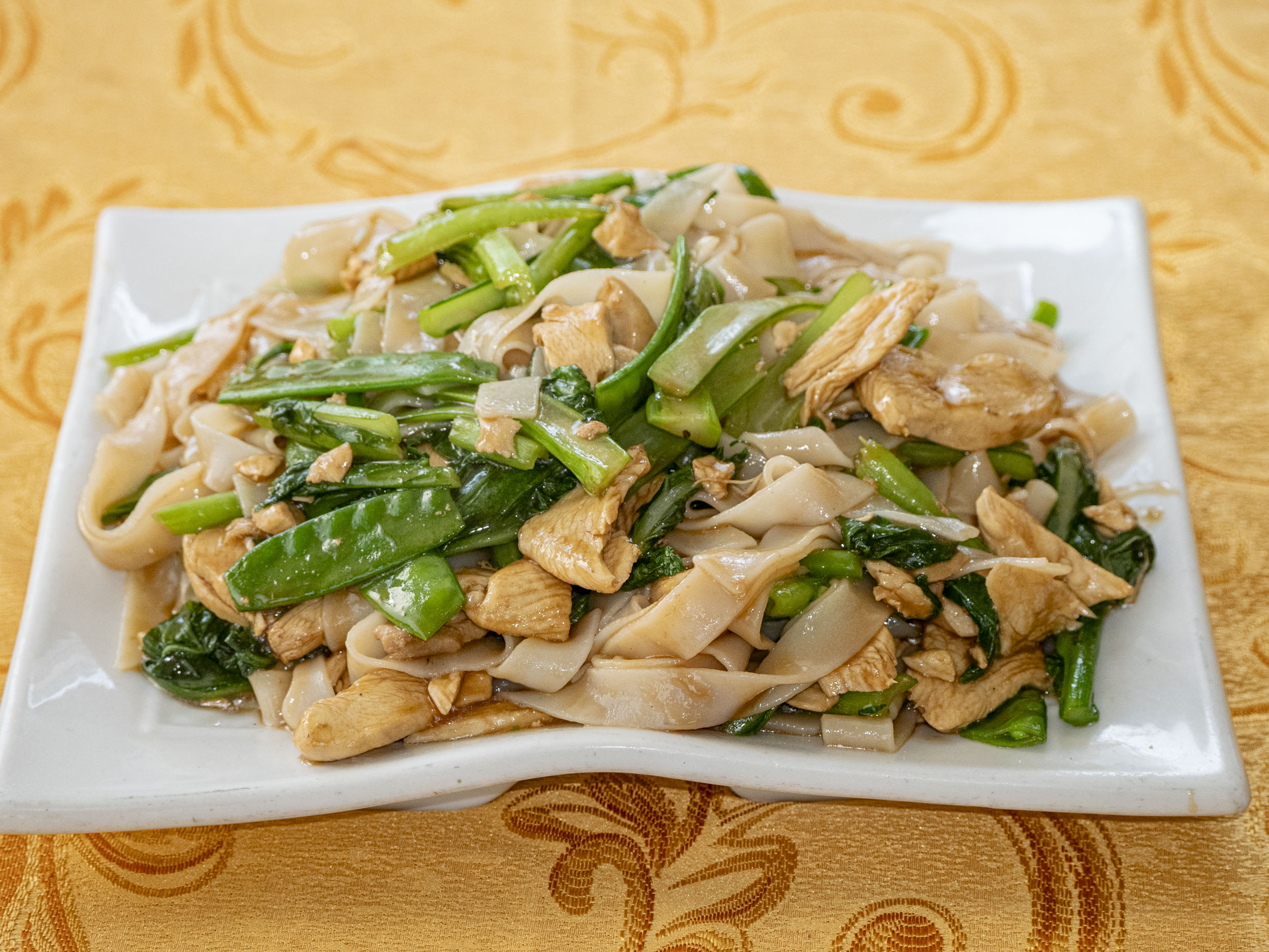 Tallarín, pollo parte pierna en trozos, col china, brócoli, pimentón y holantao.