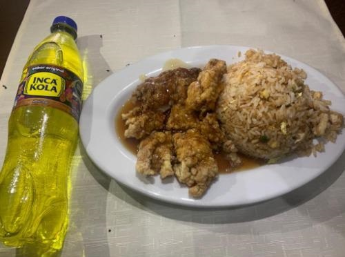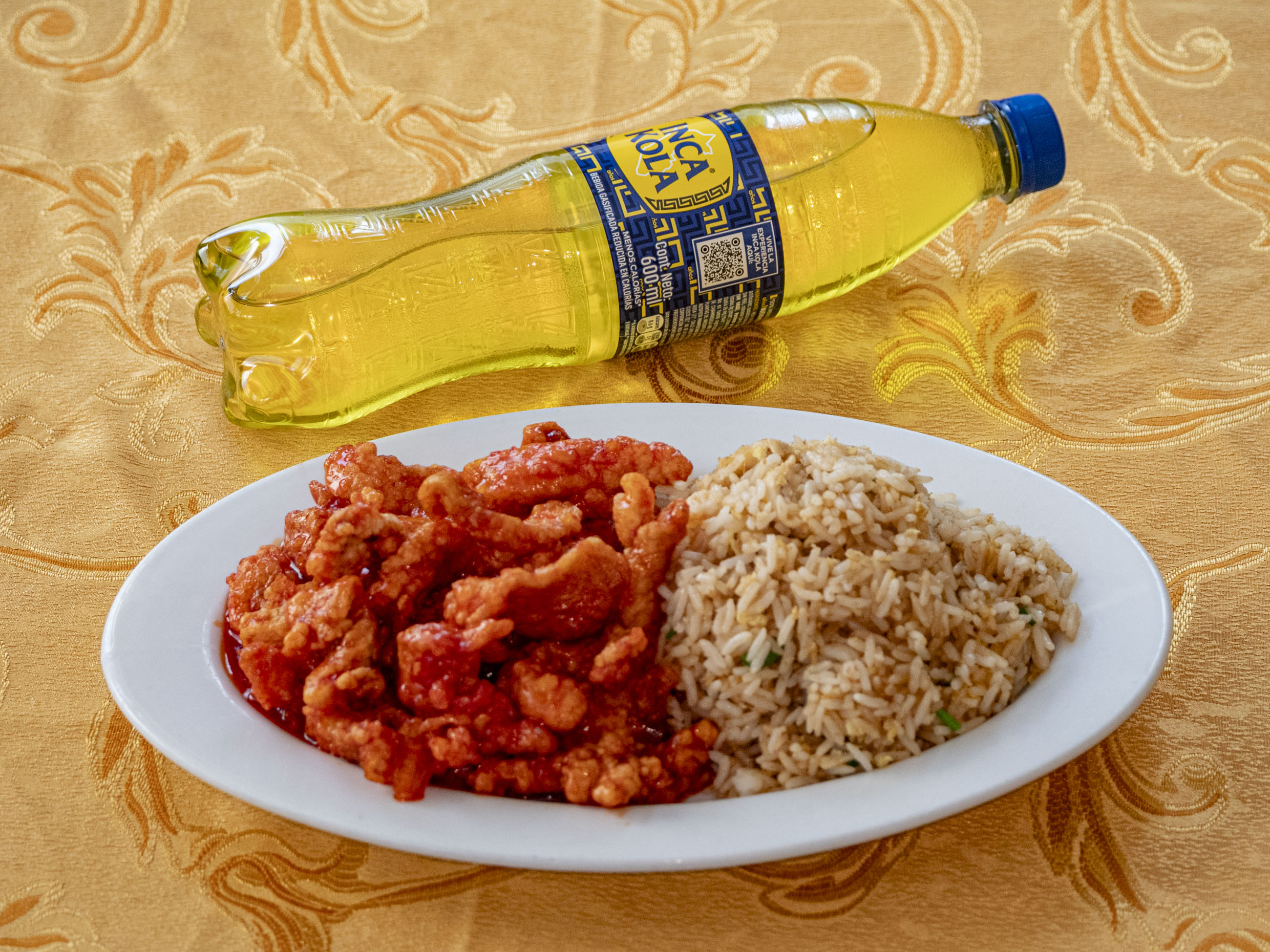 Pollo salado, pollo dulce, chaufa de pollo y gaseosa de 500 ml.