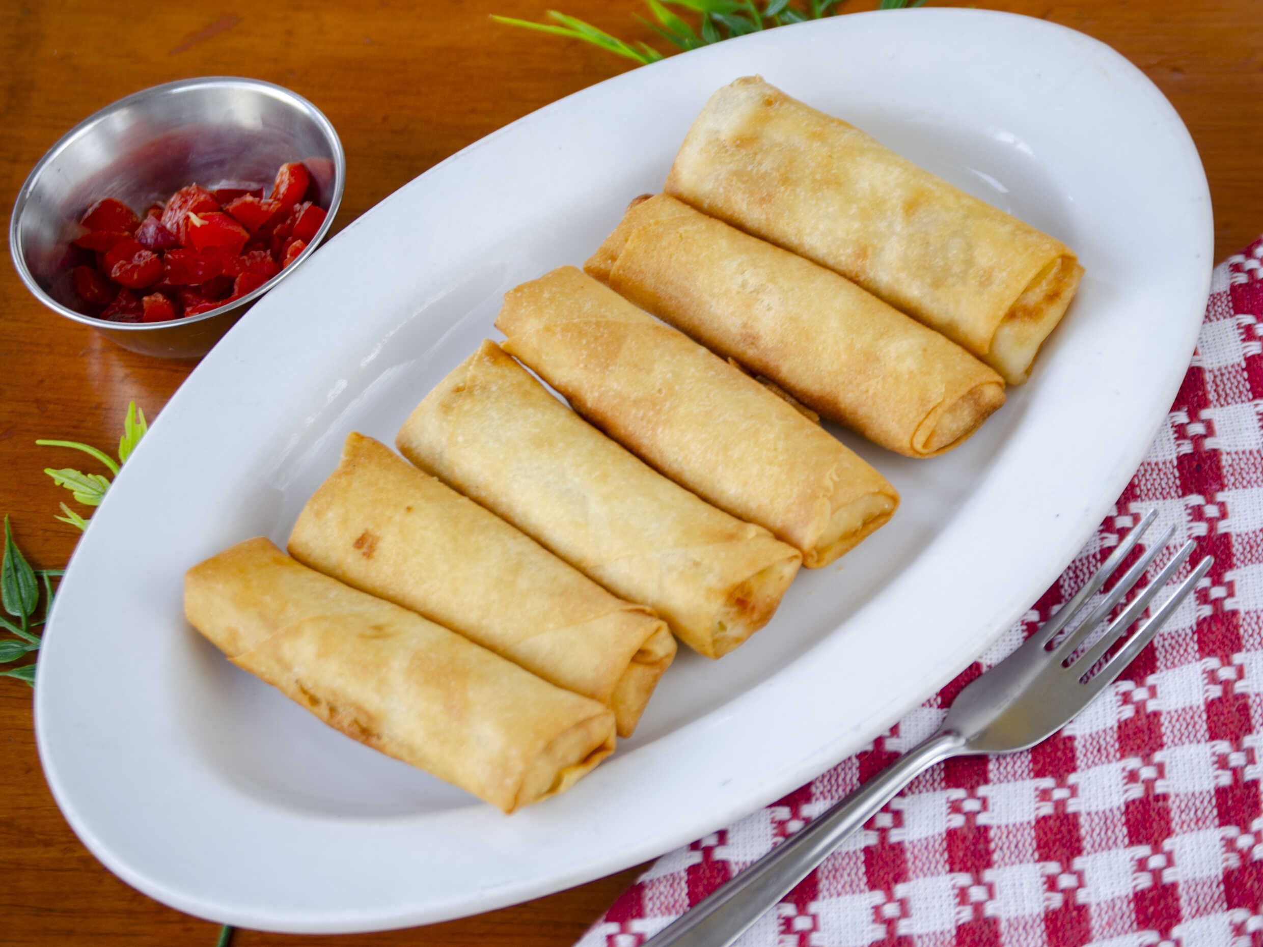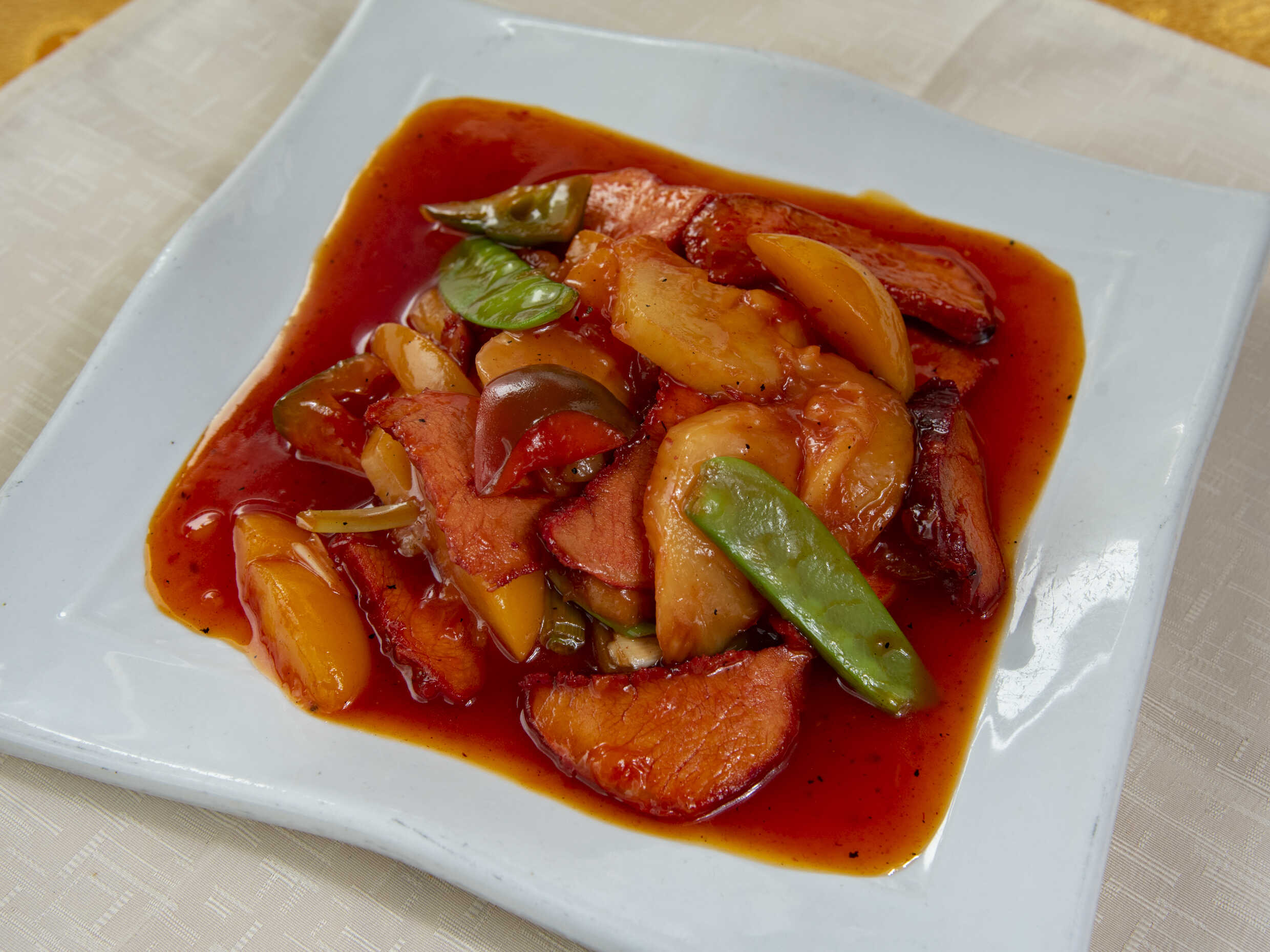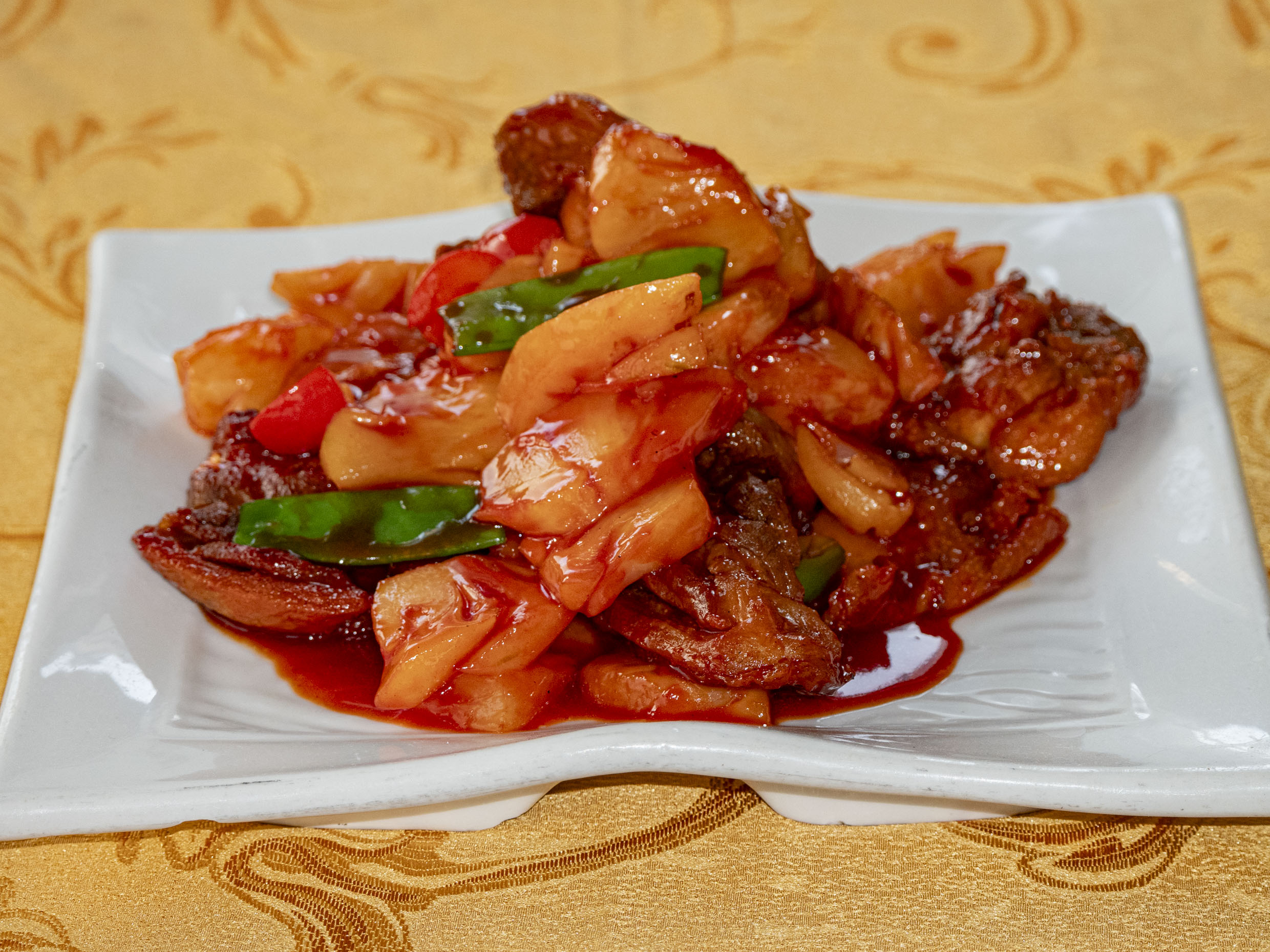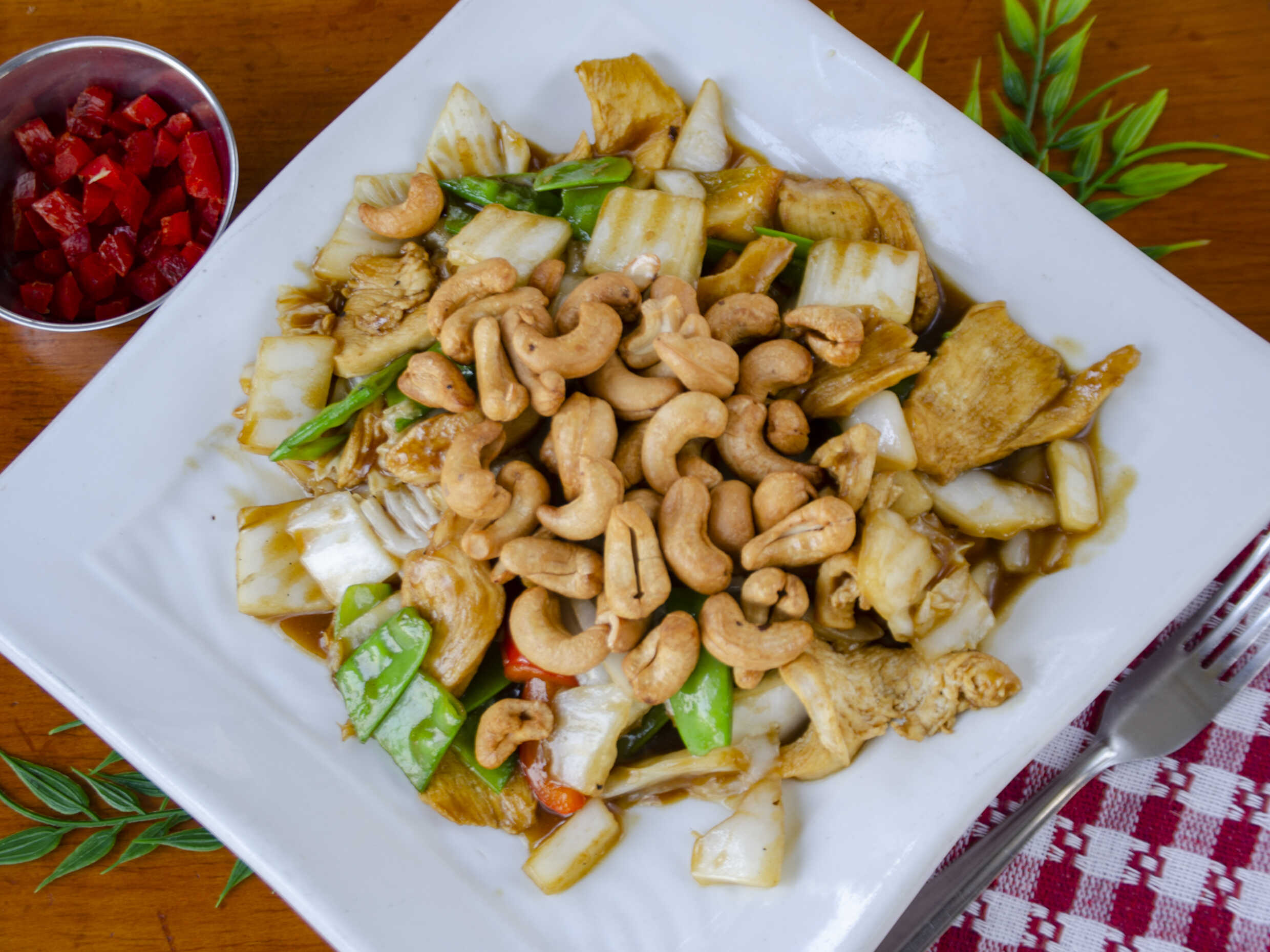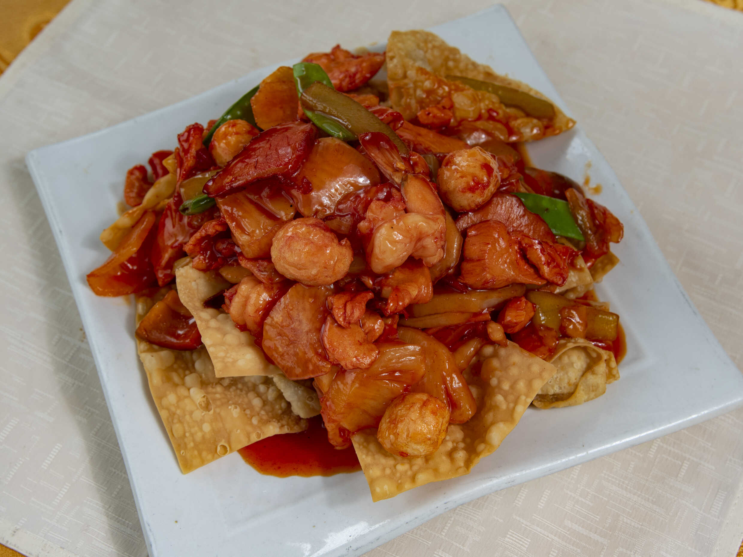 1 plato tay pa grande, 1 pollo enrollado con verduras, 1 kam lu wantan grande.