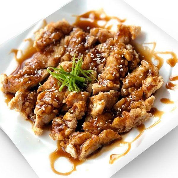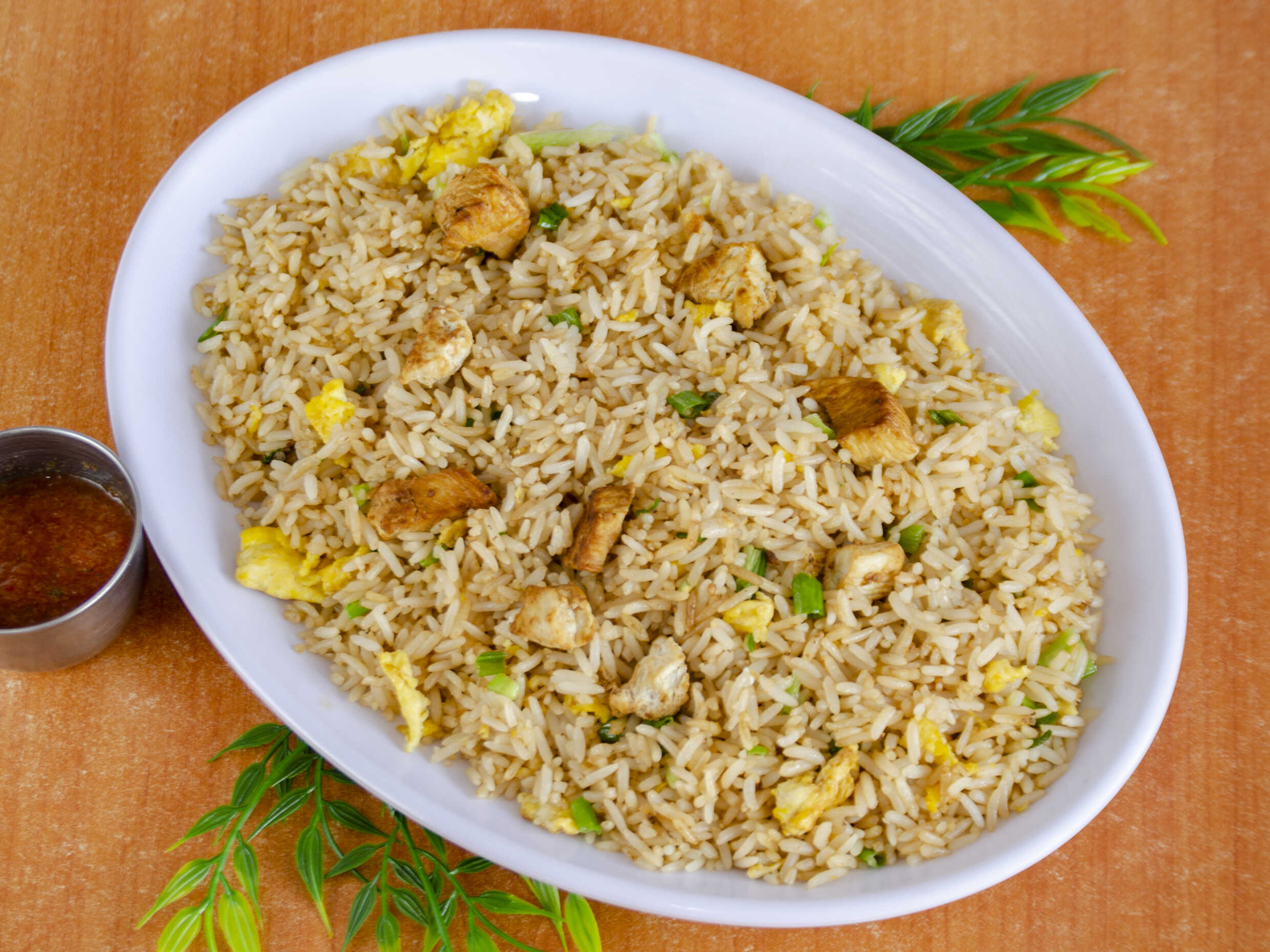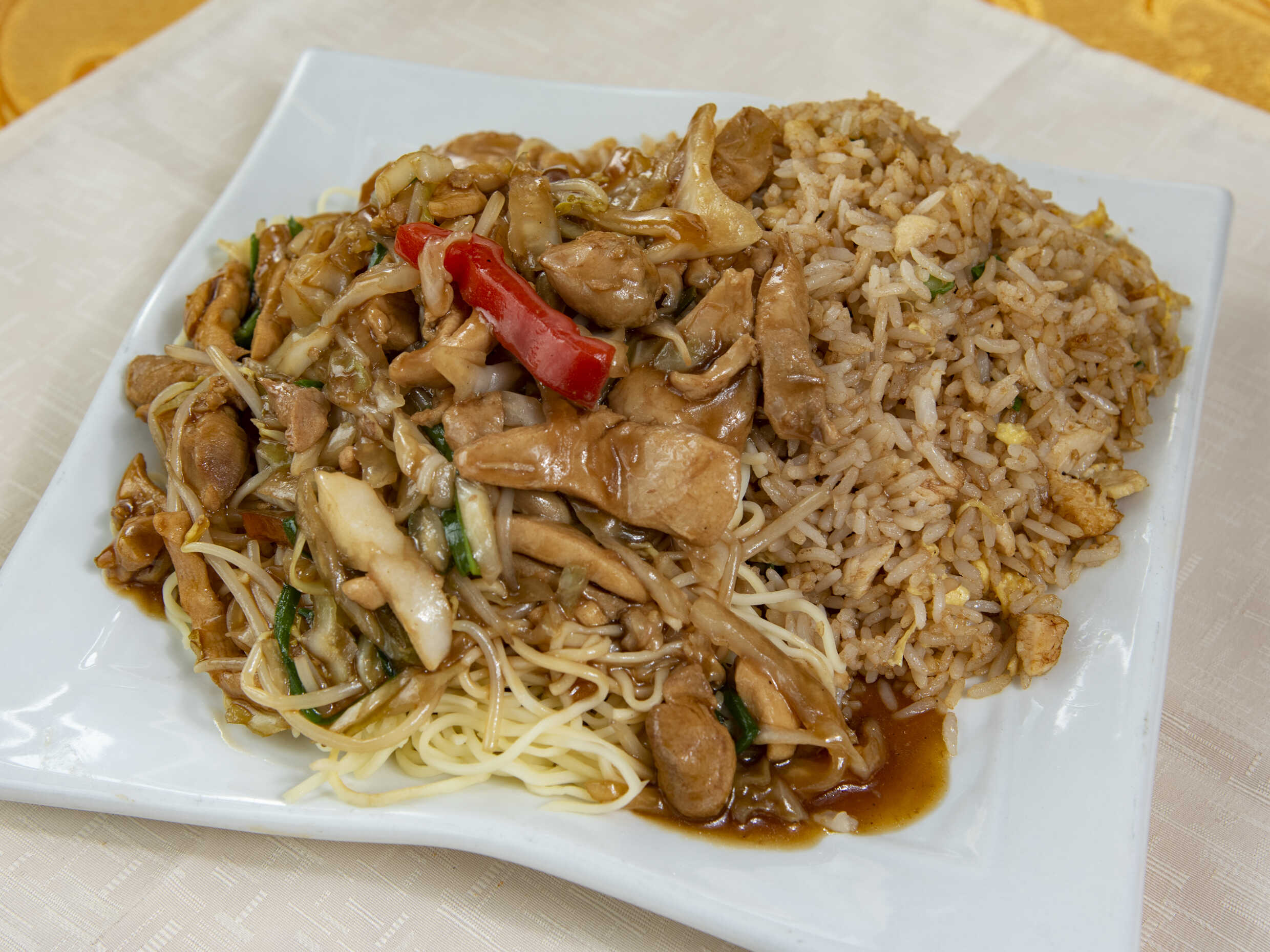 Pollo frito con salsa de ostión con chaufa de pollo.