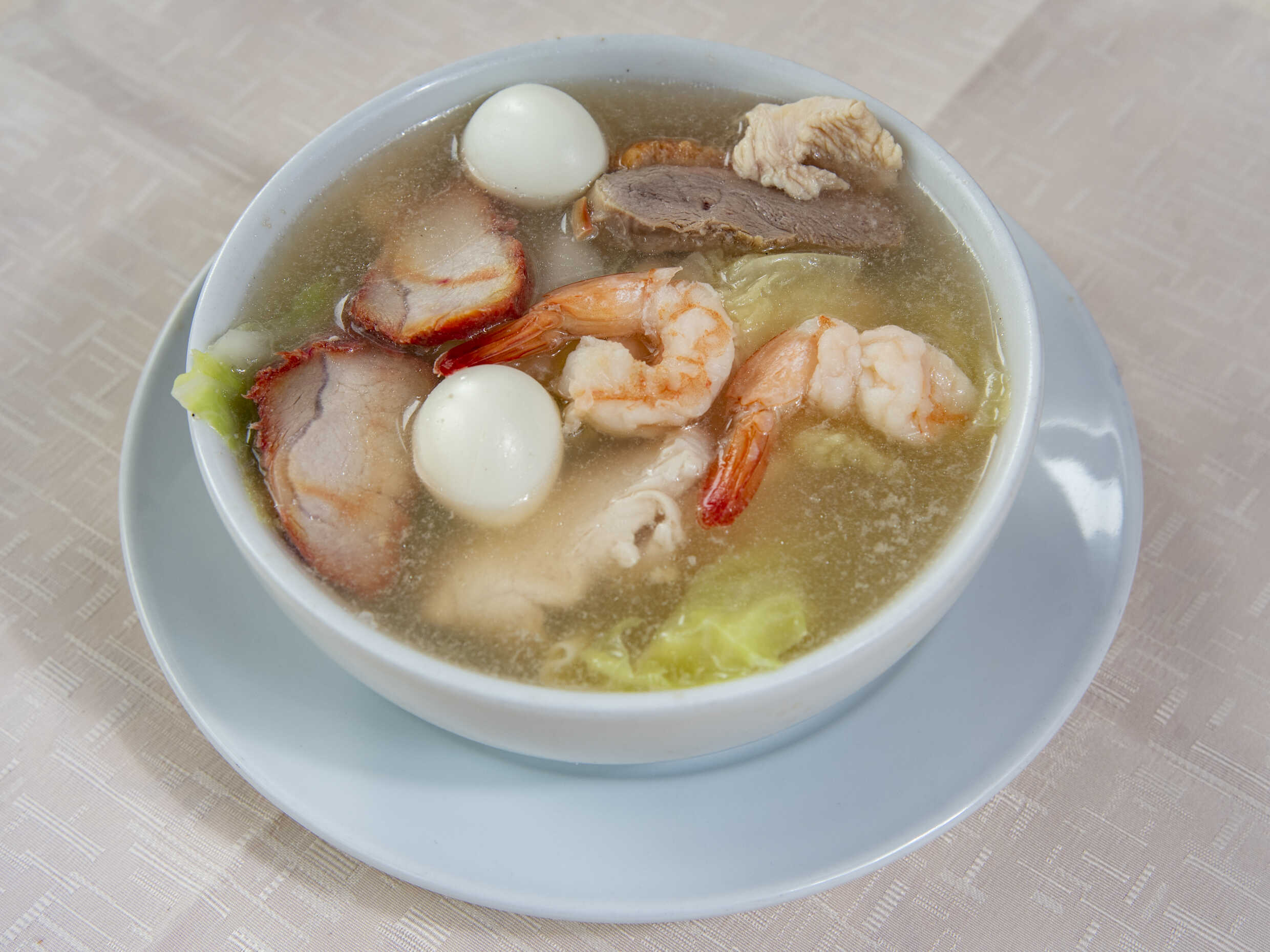 Caldo de pollo, filete de pollo, langostinos, pato, cerdo, pasta y wantan.