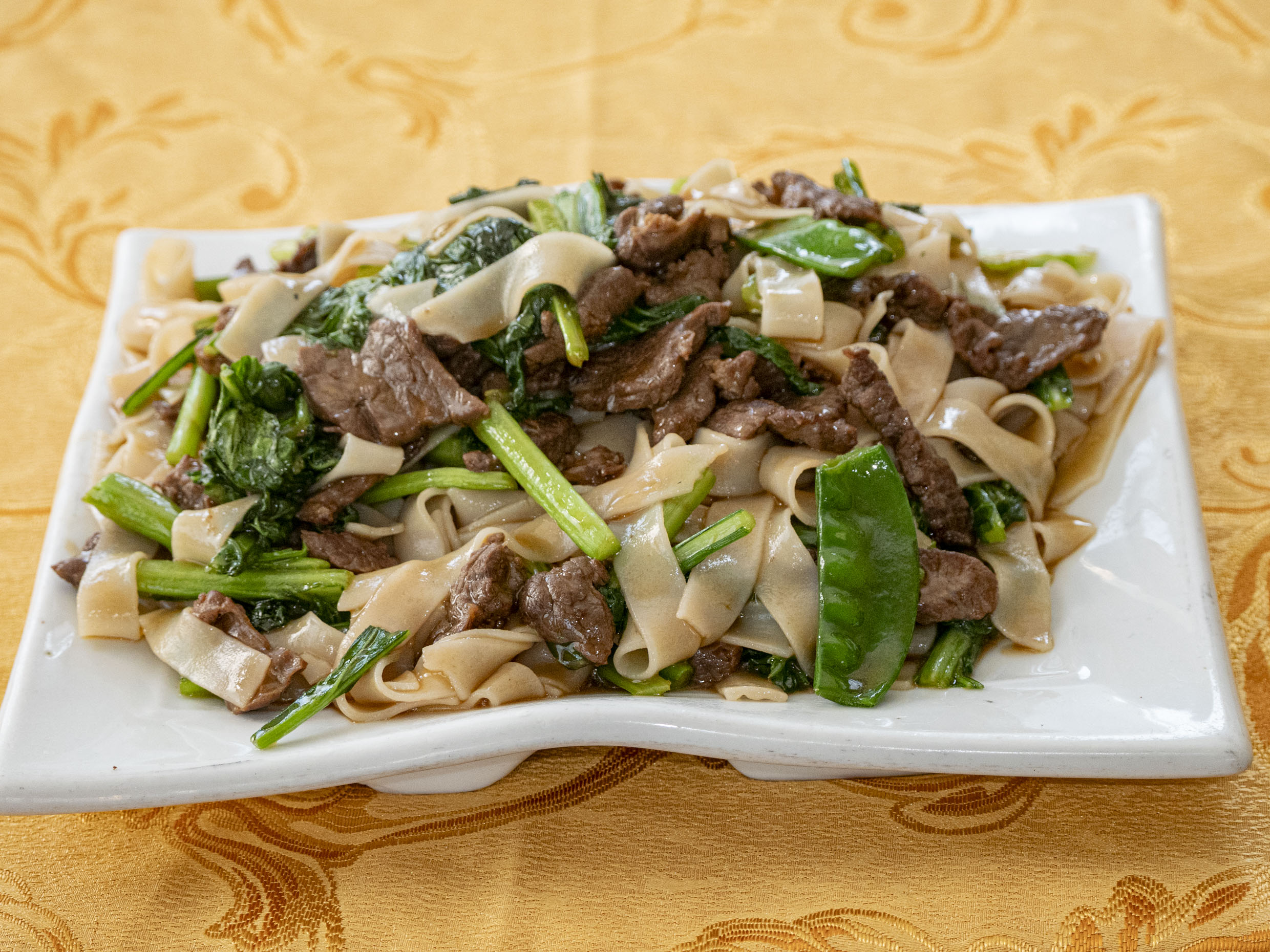 Carne, fideos, ajo, chino, frijol chino y salsa de ostión.