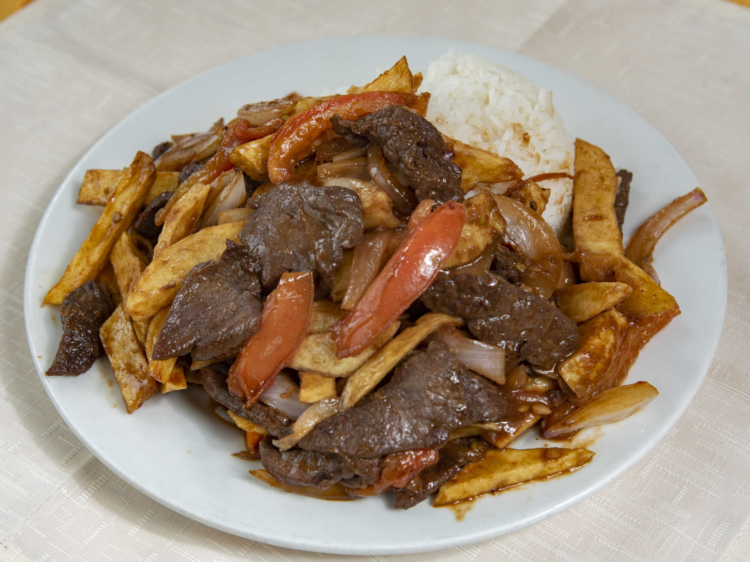 Lomo, cebolla, tomate, ají, papas fritas y arroz blanco.