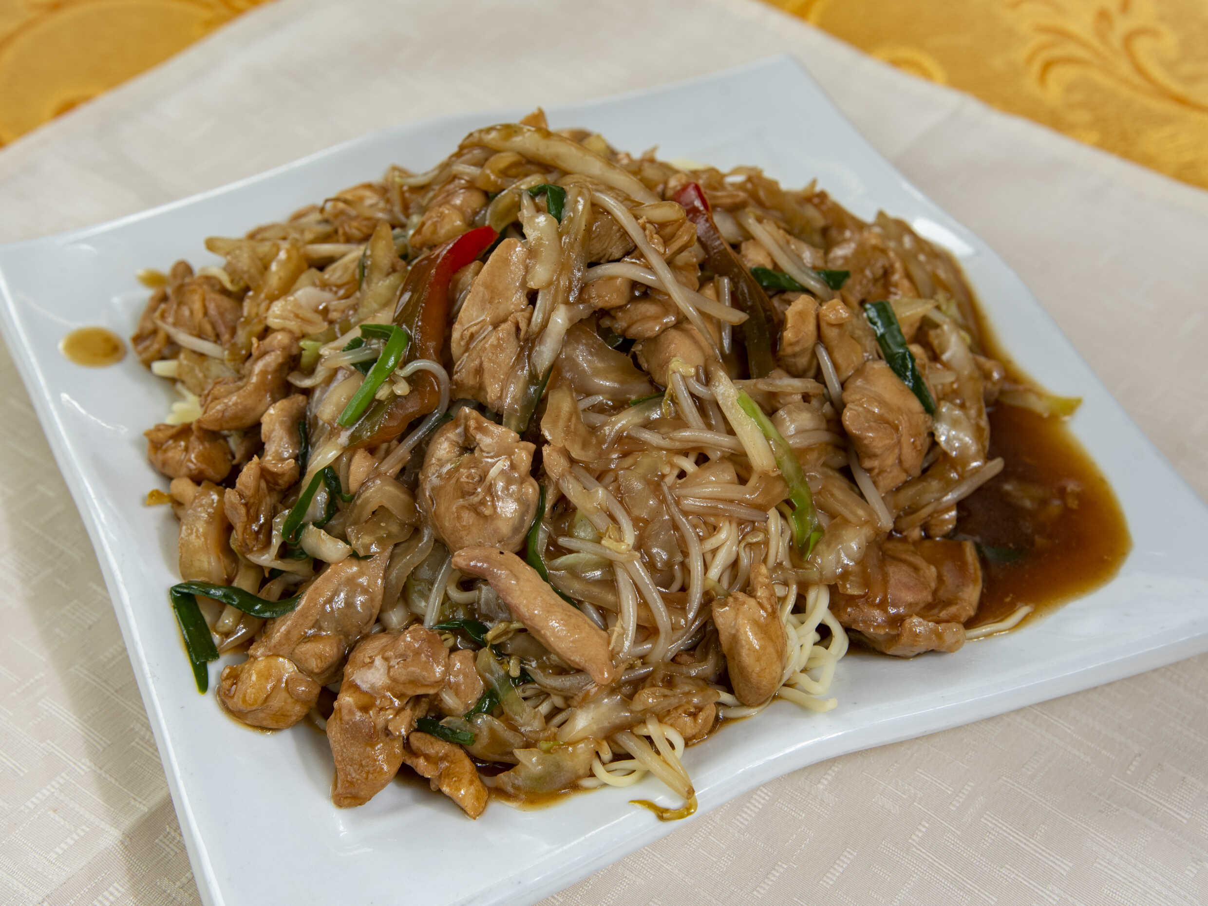 Pollo, fideos, ajo, chino, frijol chino y salsa de ostión.