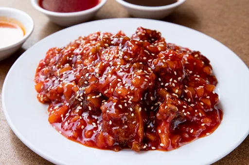 Pollo frito, salsa de tamarindo y nabo encurtido.