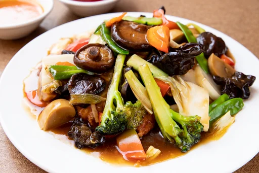 Pollo saltado, verduras, yuyo, champiñón y huevito de codorniz.
