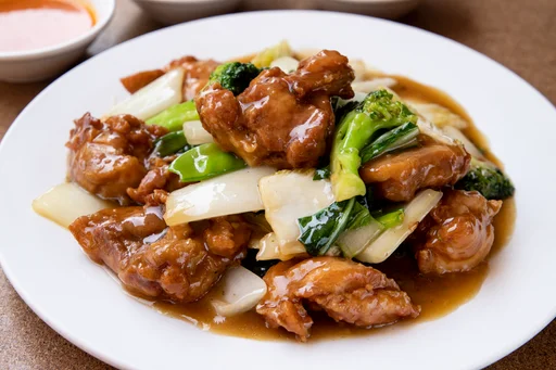 Pollo con brócoli, holantao, col, pimentón y pak choi.