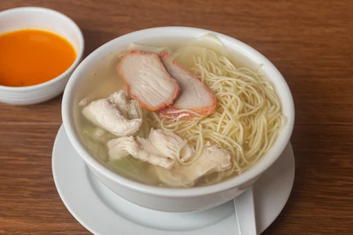 Sopa con tallarín, pollo, chancho, pato, langostinos, verduras y huevo de codorniz.