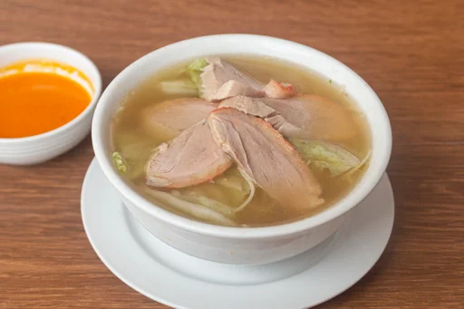 Sopa con tallarín, pollo, chancho y verduras.
