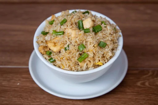 Arroz chaufa de chancho, cebolla china y huevo.