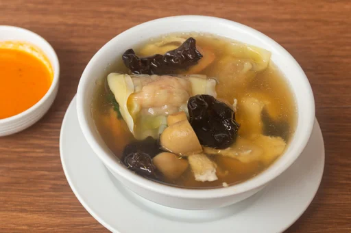 Sopa wantán con pollo, chancho y verduras.