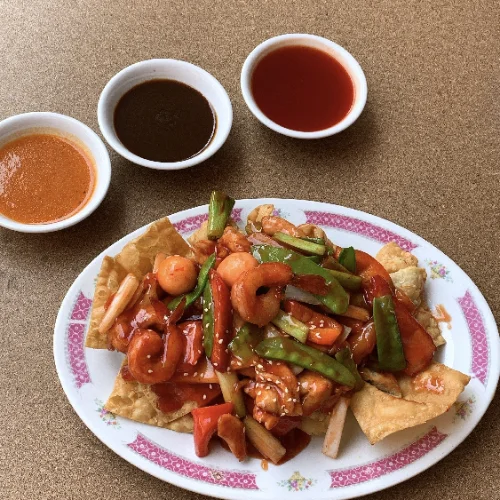 Kam lu wantán de pollo, chancho, pato, langostinos, piña, tamarindo, holantao, pimiento y brócoli, wantán 16 uds.