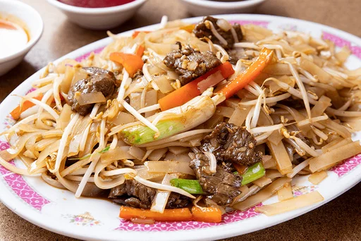 Fideos con carne, pimentón y frejolito chino.