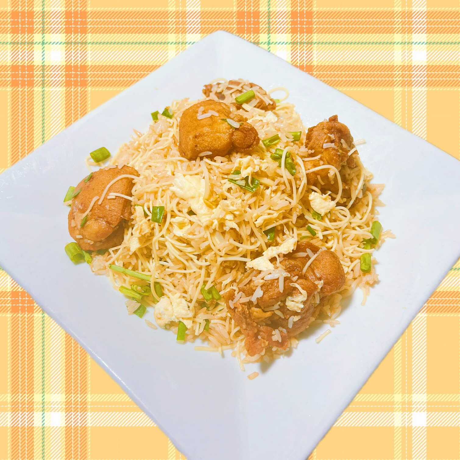 Arroz saltado con tallarín, pollo y frejolito chino.