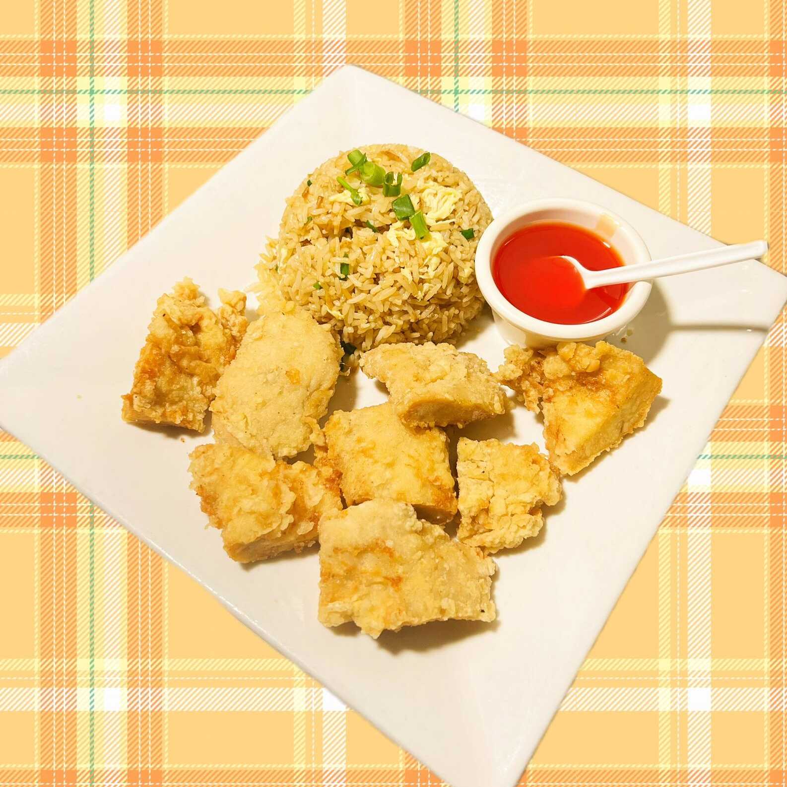 Porción de arroz chaufa, pollo en salsa agridulce de limón.