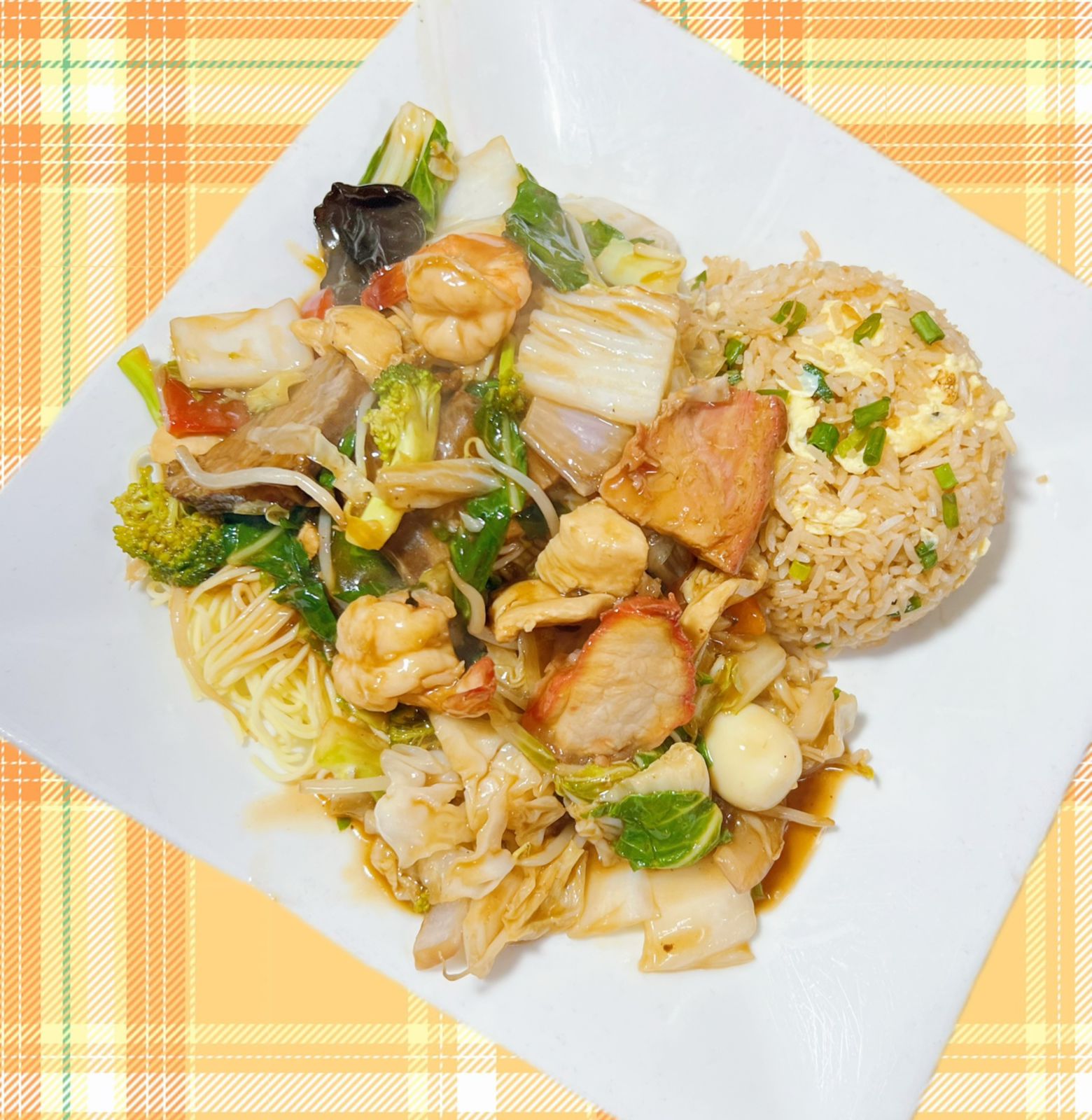 Arroz salteado con tallarín, pollo, chancho, carne, langostinos y frejolito chino.