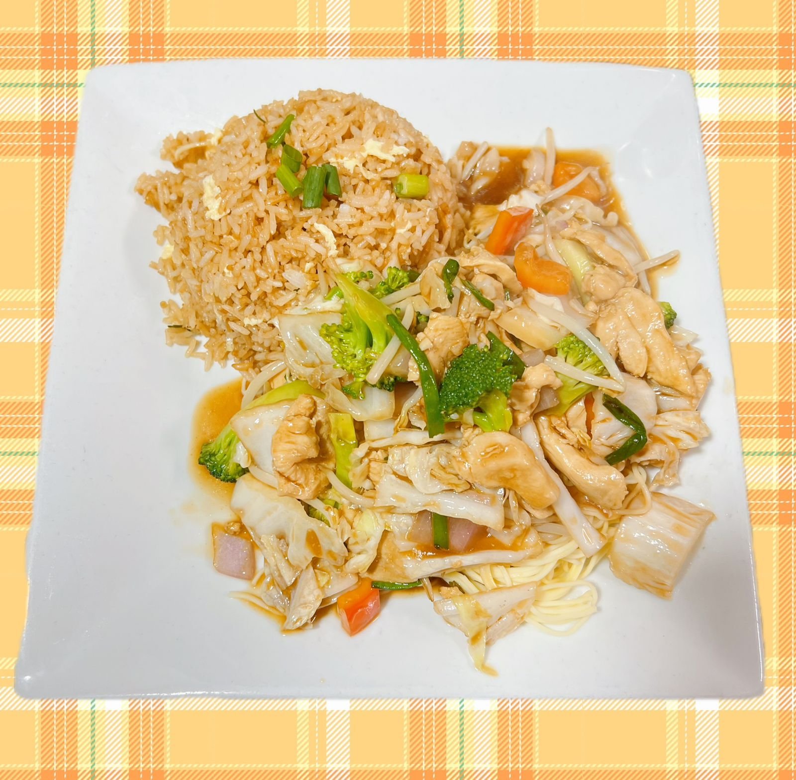 Porción de chaufa y pollo con tallarín más verduras mixtas.