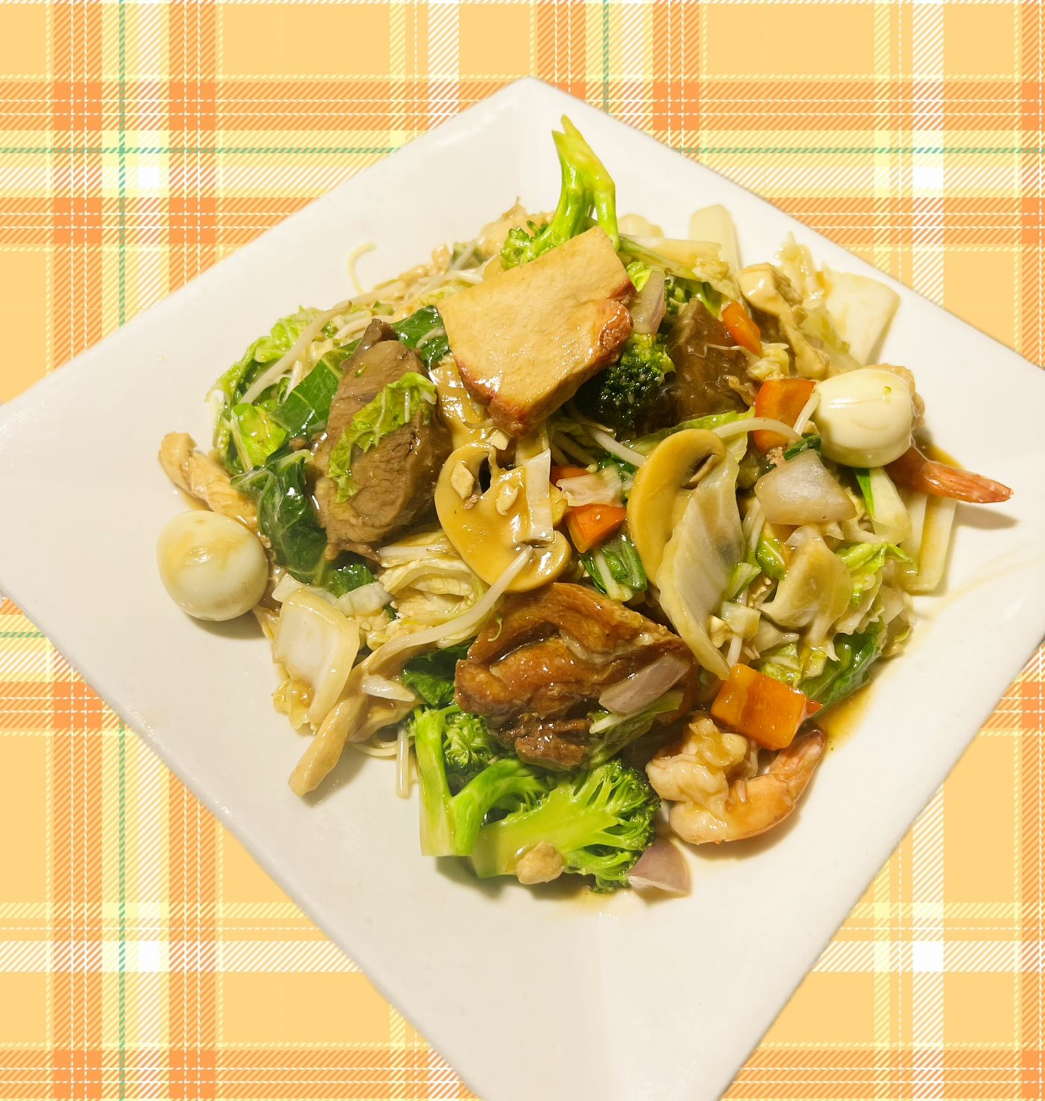 Tallarín con pollo, chancho, carne de res, langostinos, huevo de codorniz y verduras de temporada.