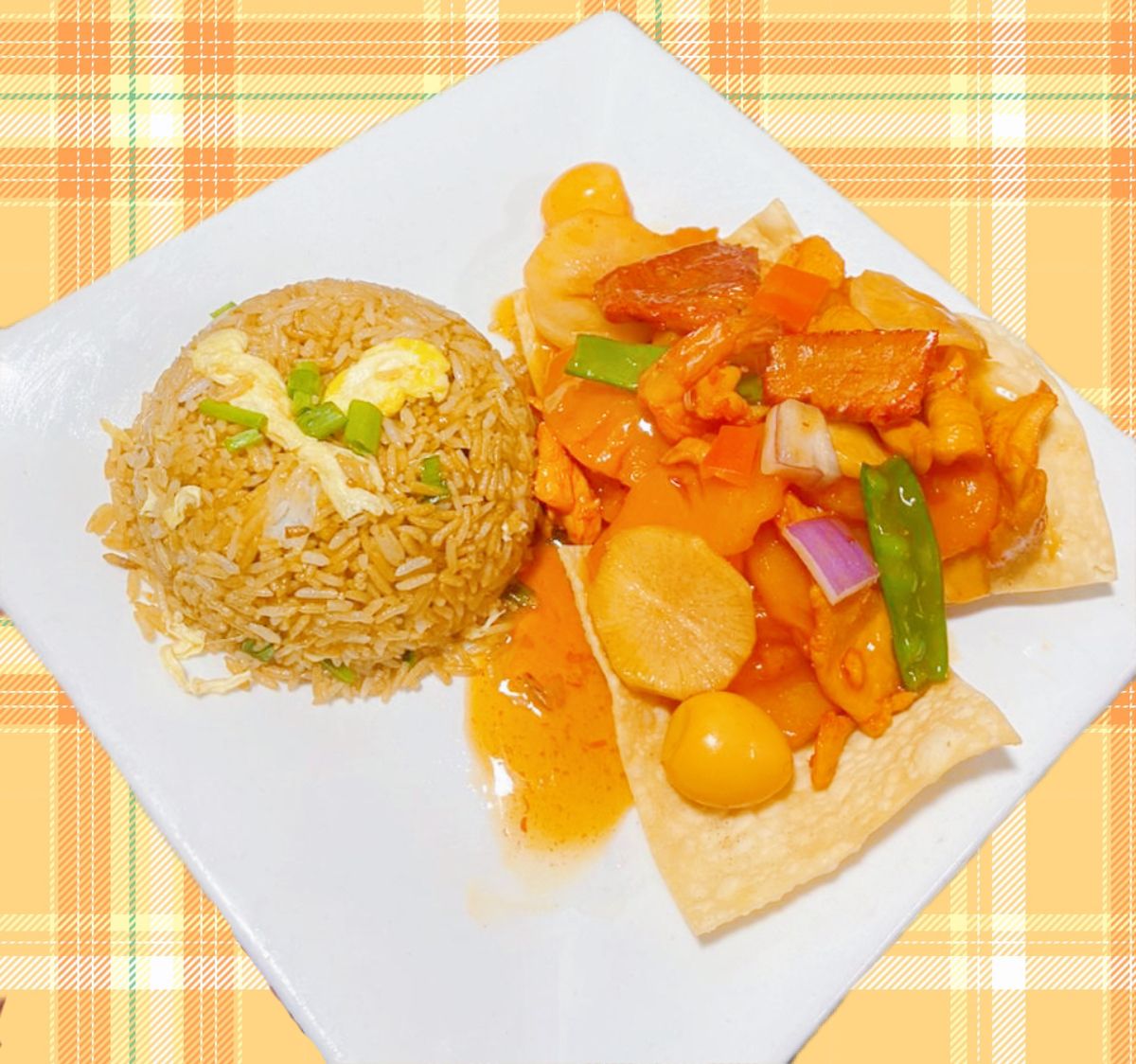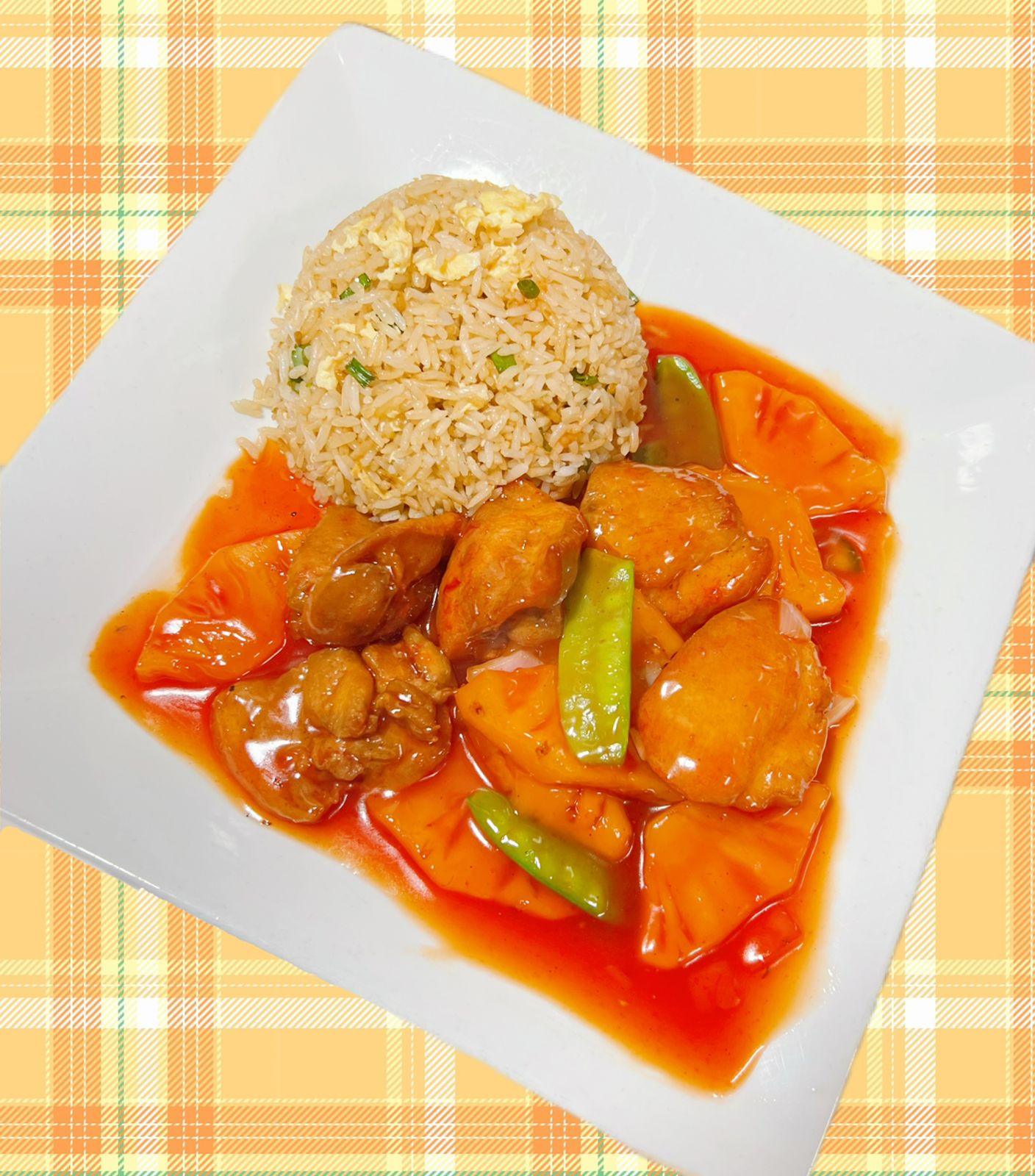 Porción de arroz chaufa, pollo en salsa agridulce de limón.