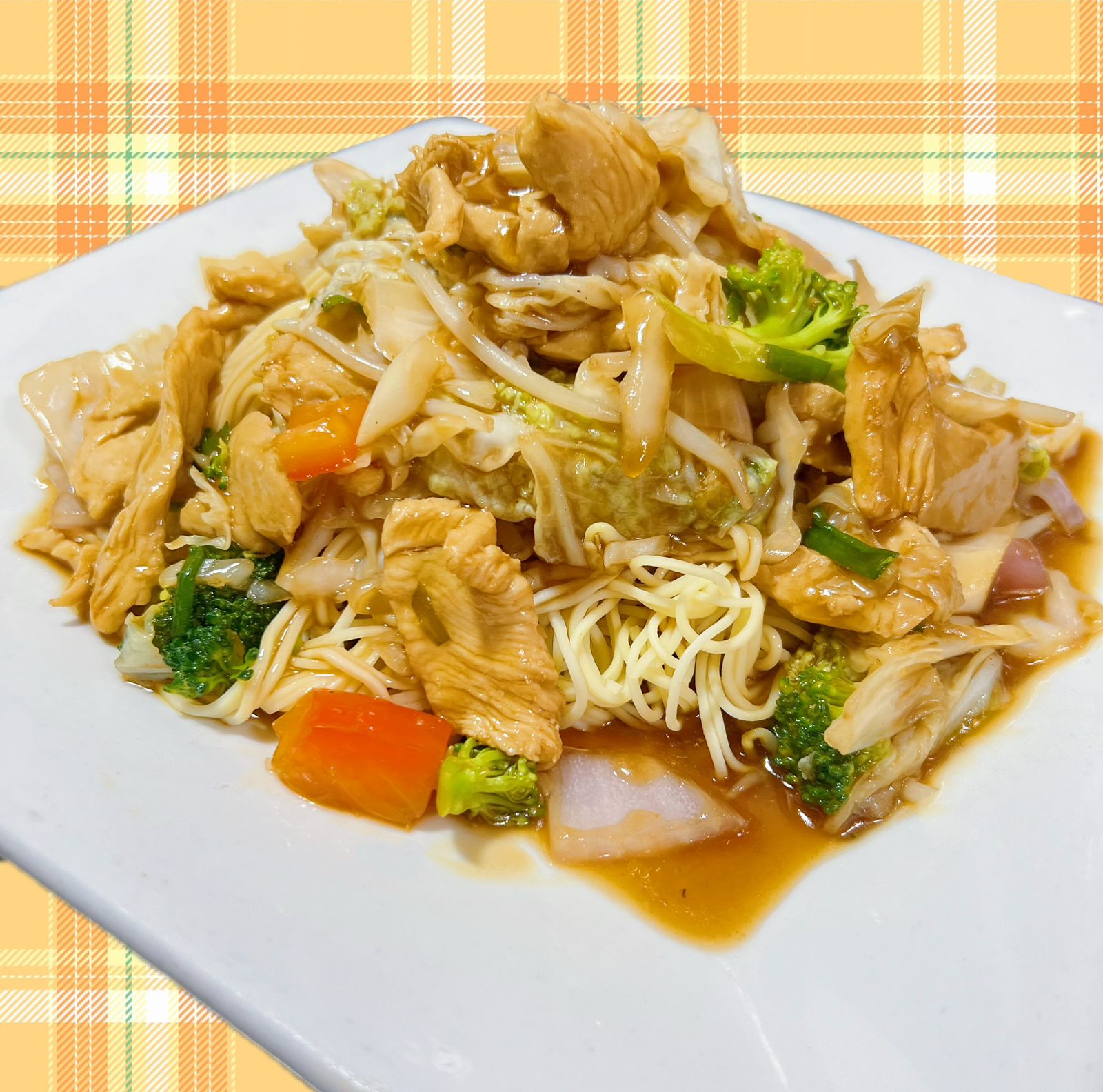 Tallarín con pollo, chancho, carne, langostinos, huevo y verduras de temporada.