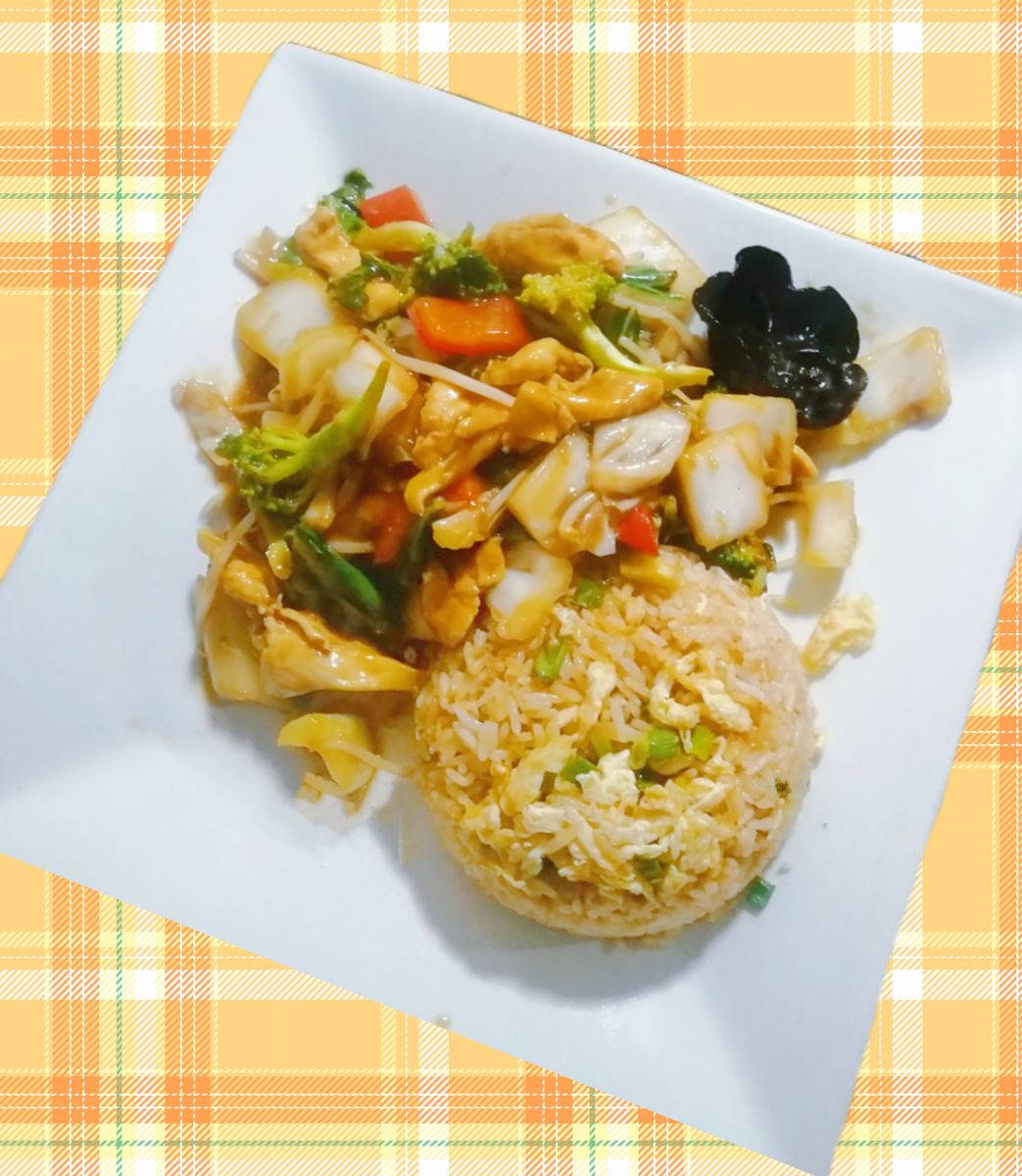 Verduras mixtas, col, brócoli, pimiento con pollo en trozos de chicharrón y arroz chaufa.