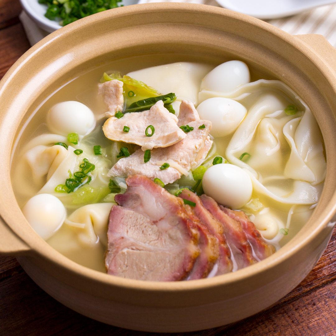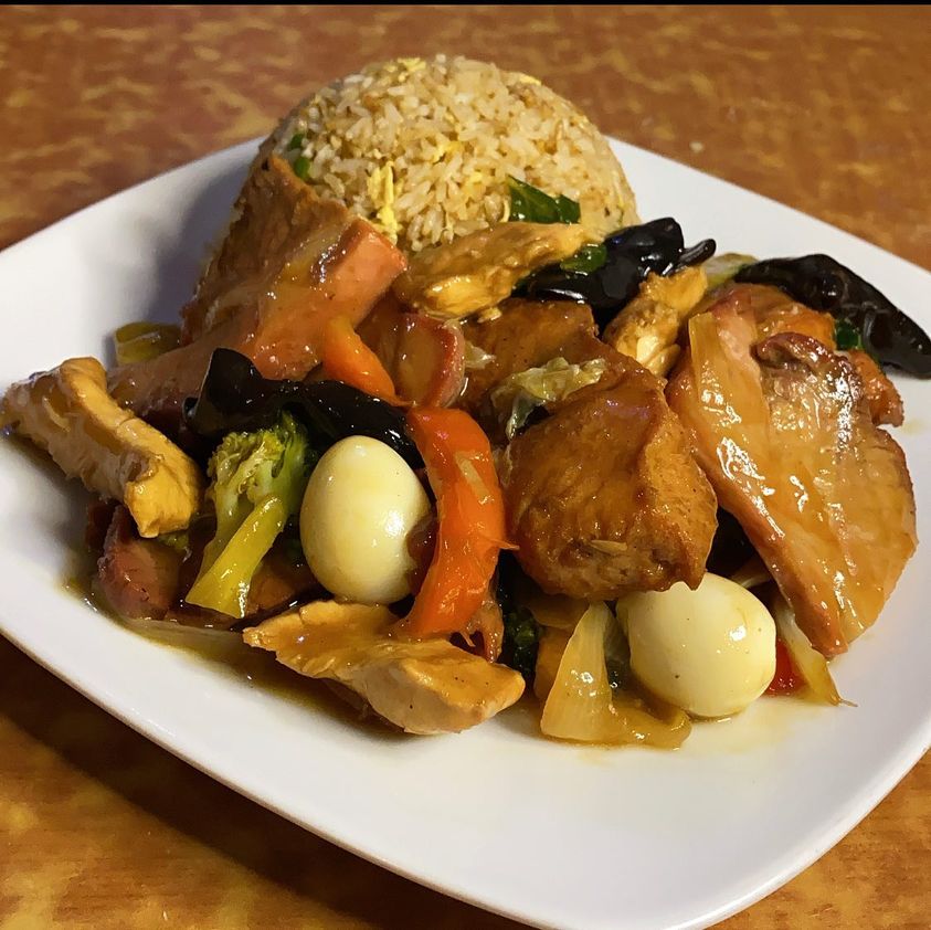 Taypá, chancho, pollo, huevo de codorniz y arroz chaufa.
