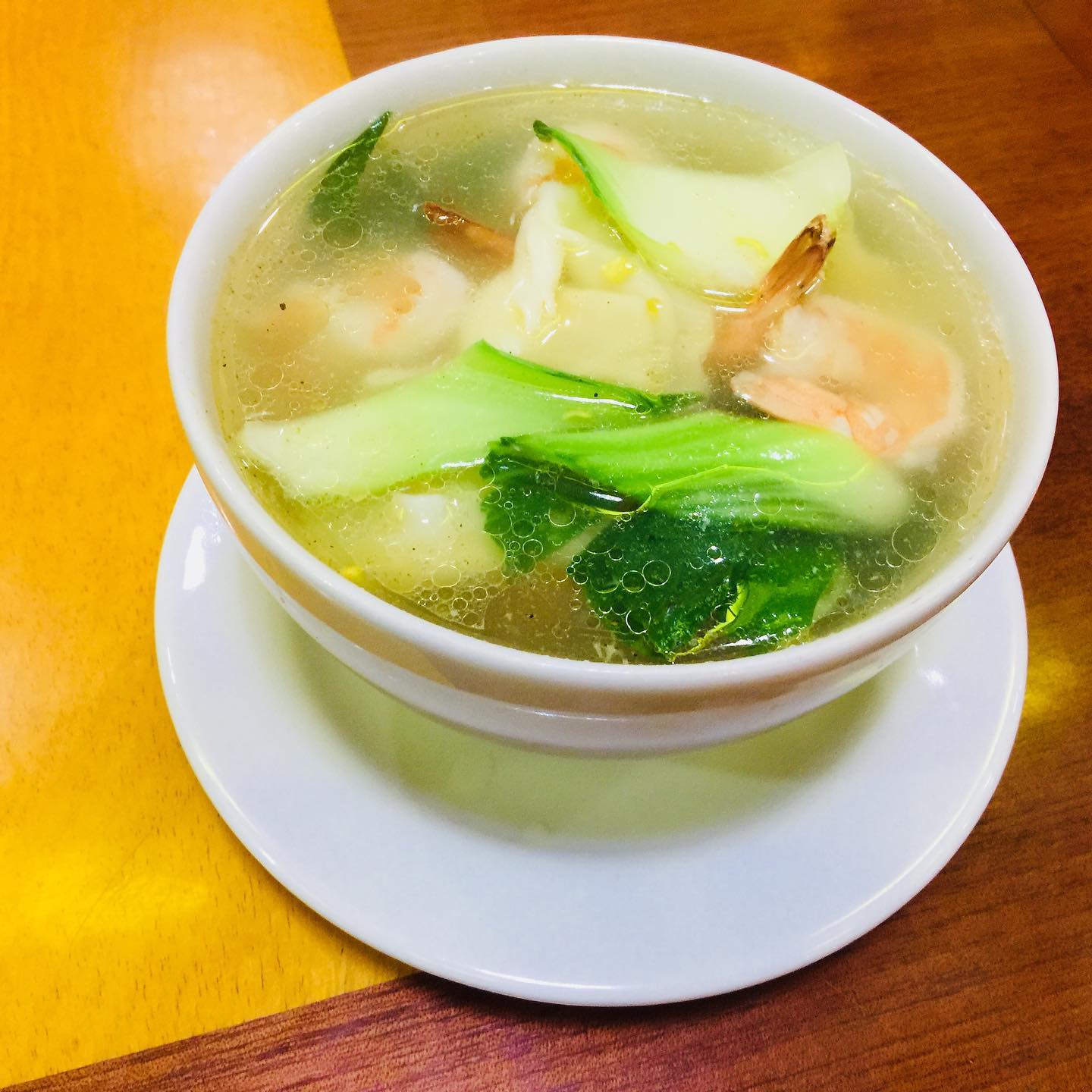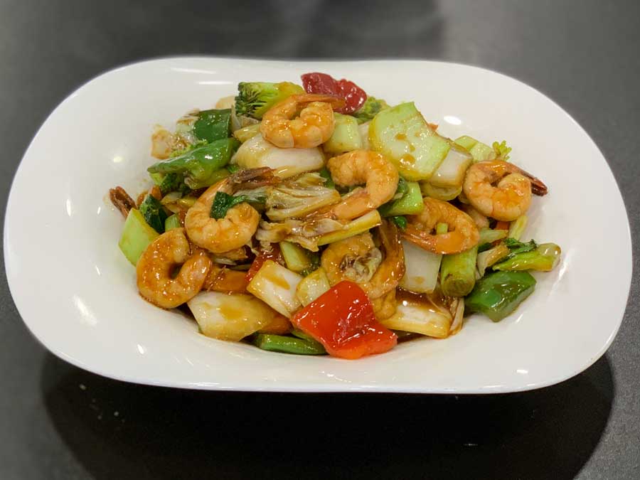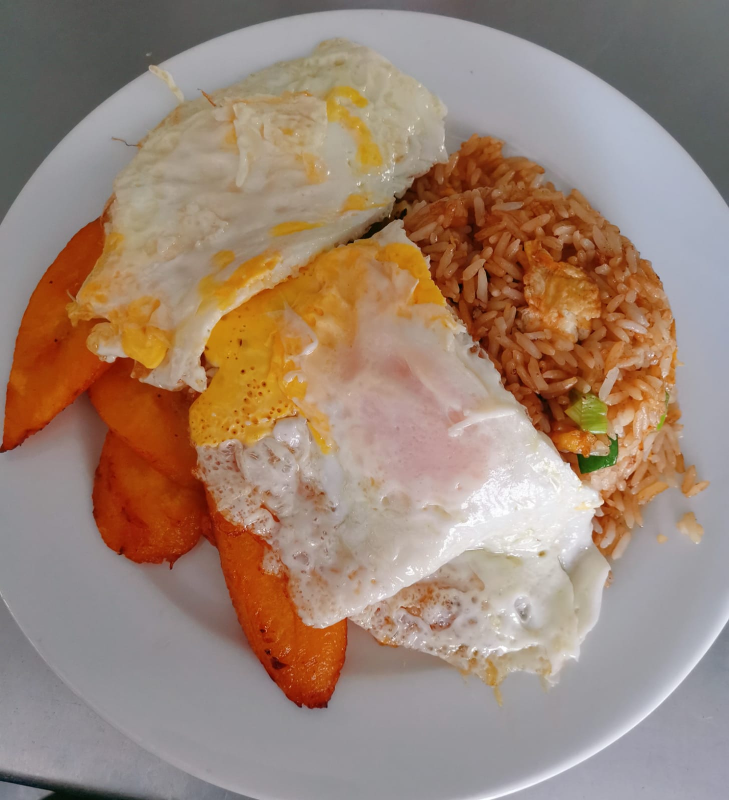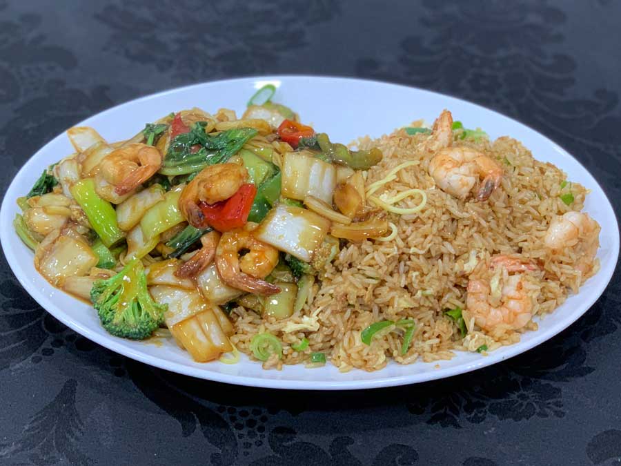Arroz chaufa, langostinos, champiñones, verduras y frijolito chino.