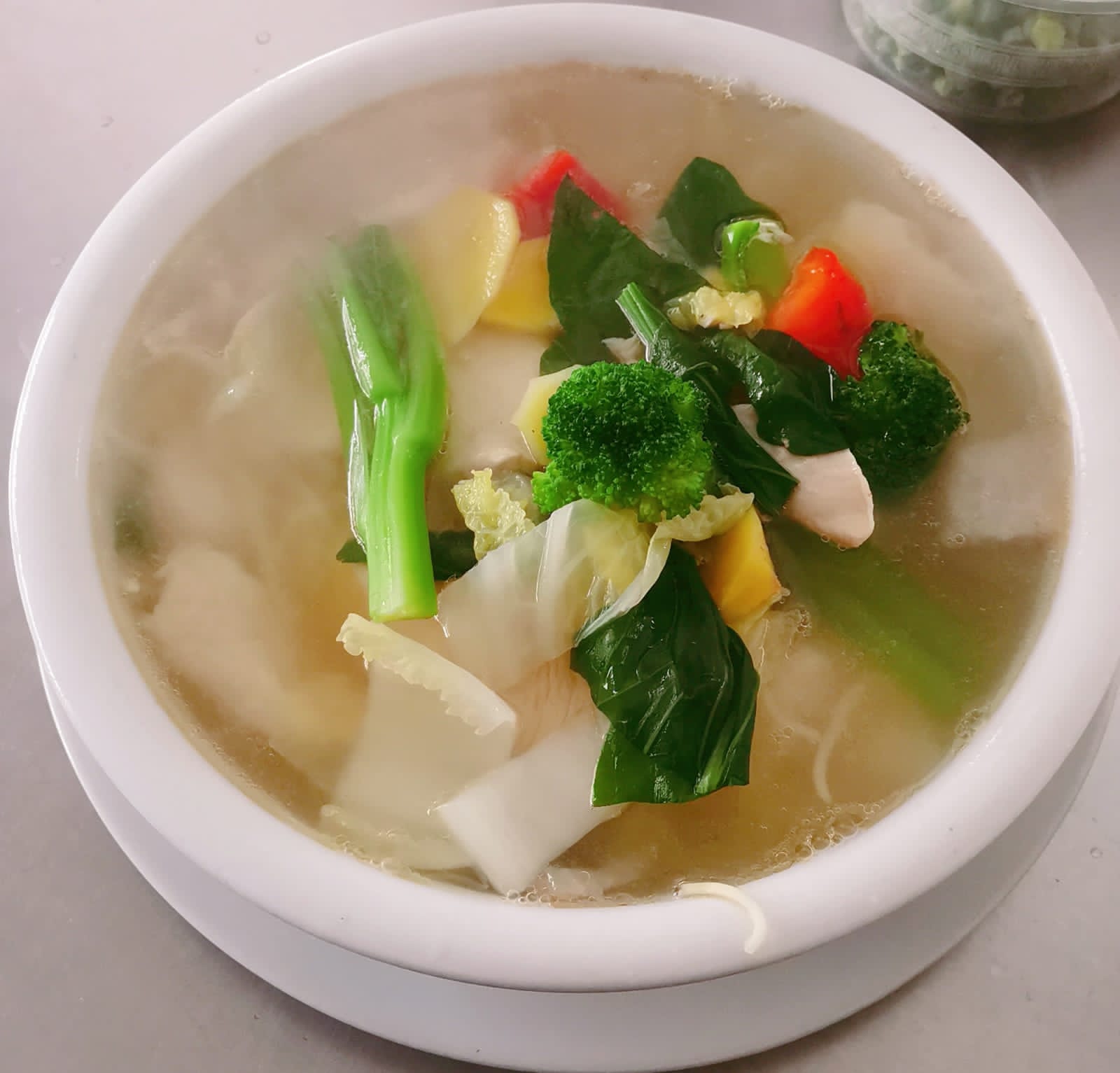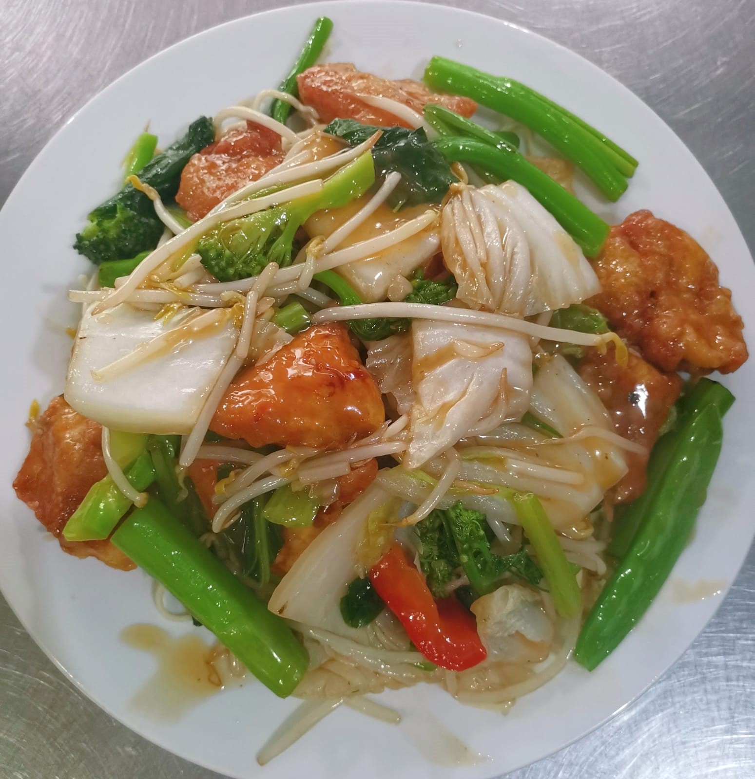 Fideo chino,pollo,procoli,col china,verdura verde.