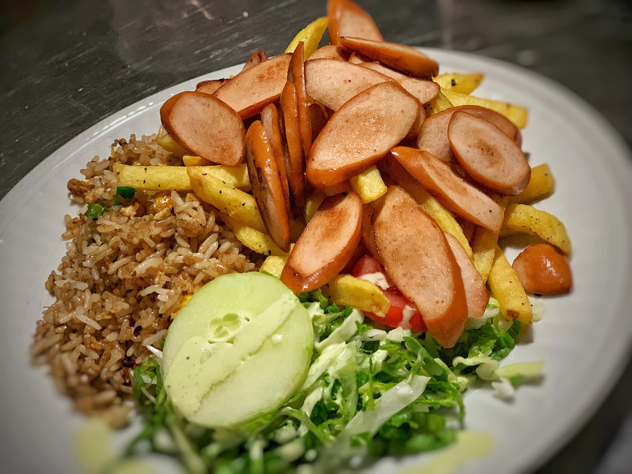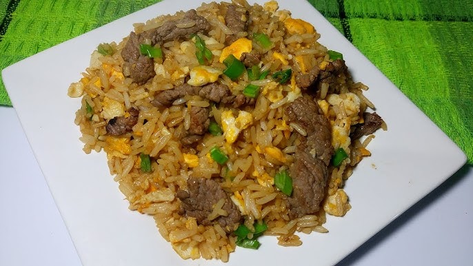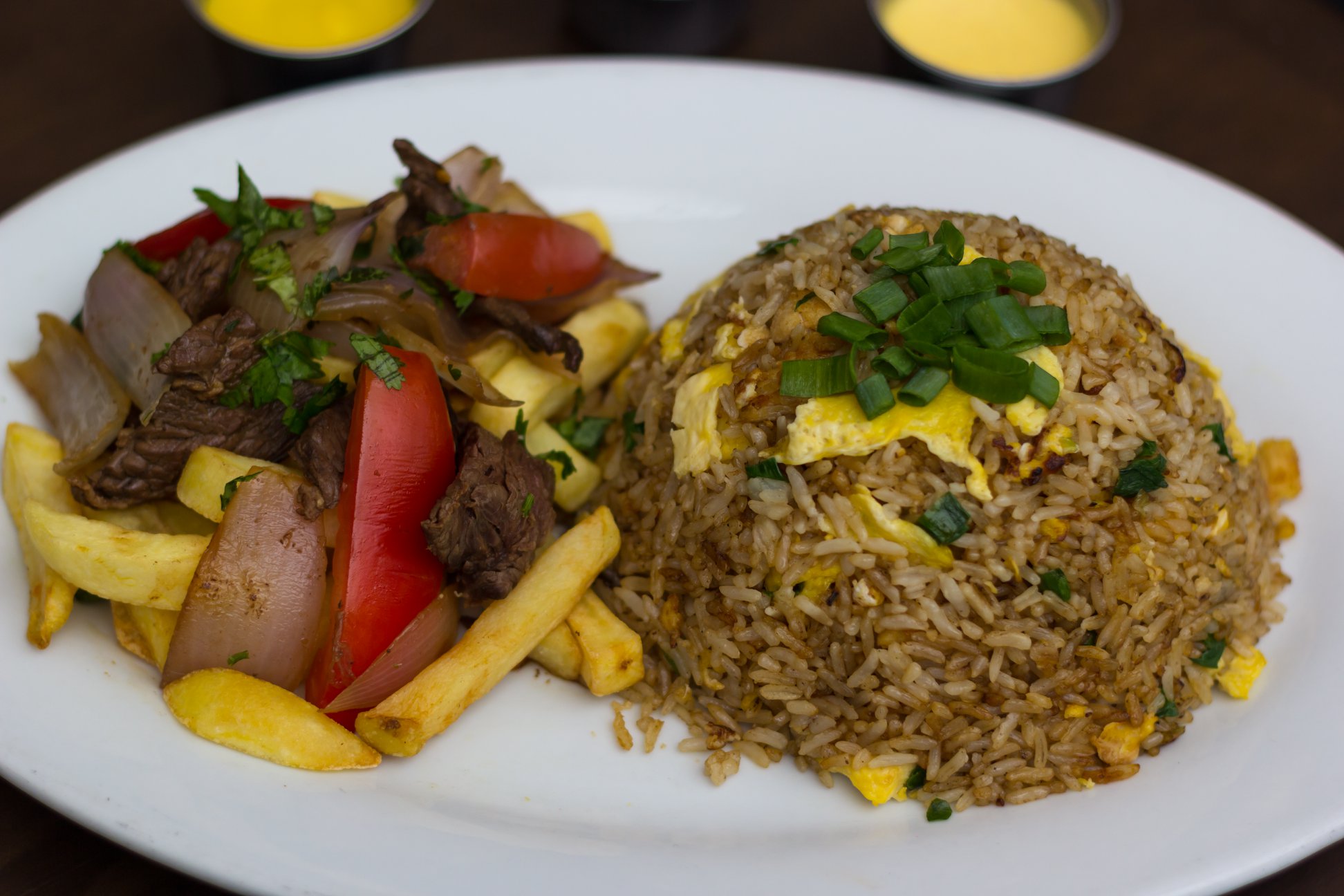 Arroz chaufa, trozos de carne, verduras, frijolito chino, zanahoria y cebolla morada.