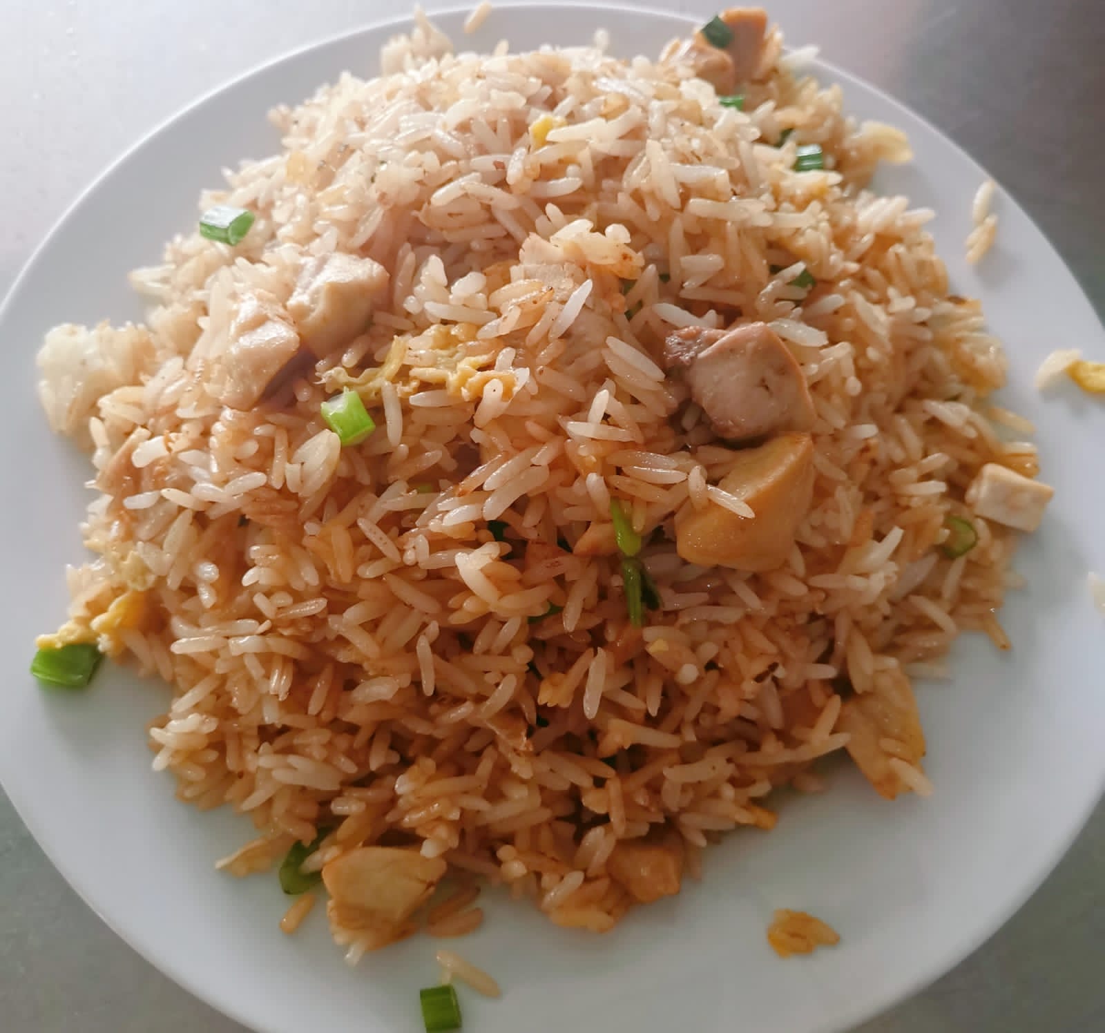 Arroz chaufa, trozos de pollo y frijolito chino.
