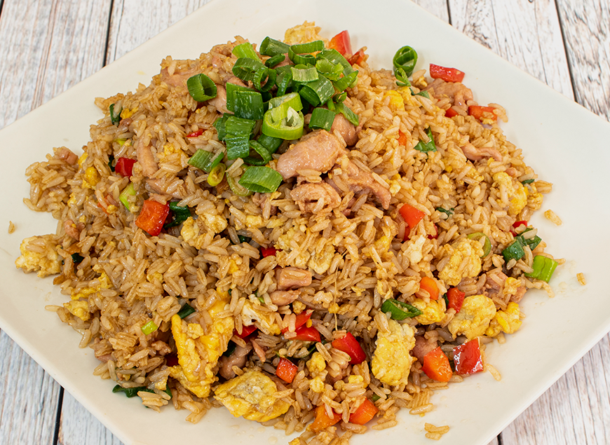 Arroz chaufa, trozos de pollo, verduras salteadas, frijolito chino y zanahoria.