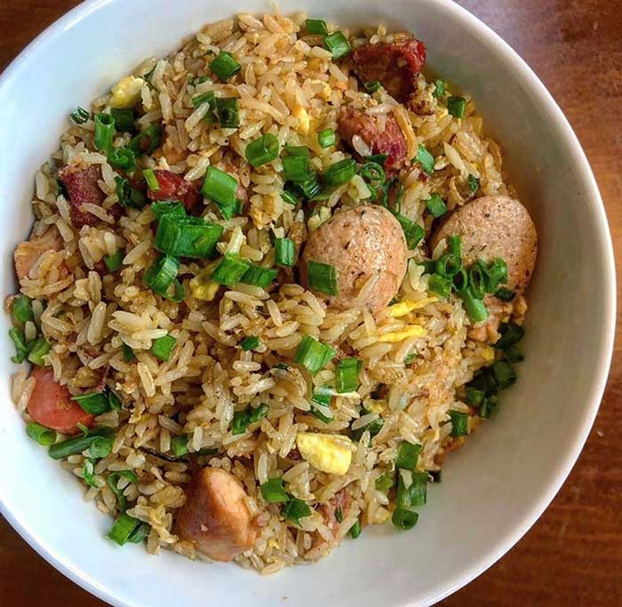 Arroz chaufa, trozos de chancho, verduras, frijolito chino, zanahoria y cebolla morada.
