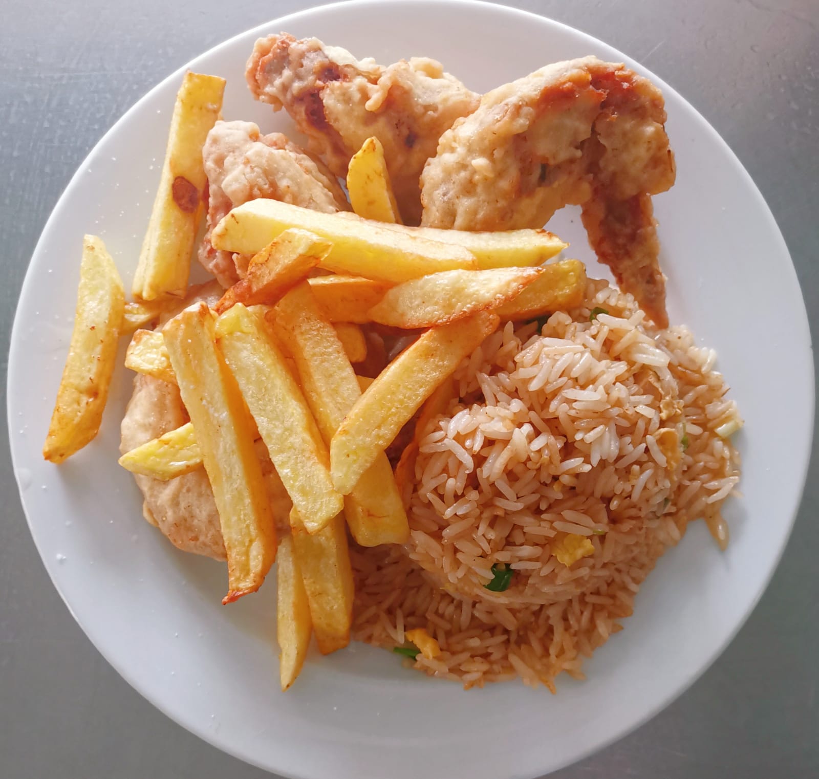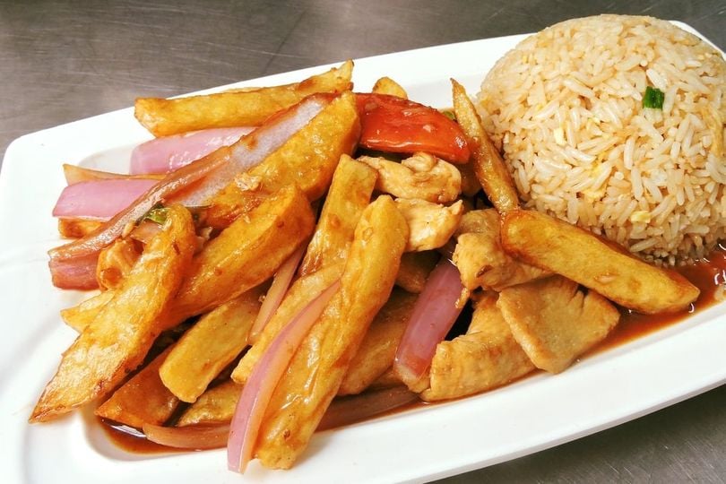 Pollo, cebolla, tomate, sillao, arroz chaufa y papas fritas.