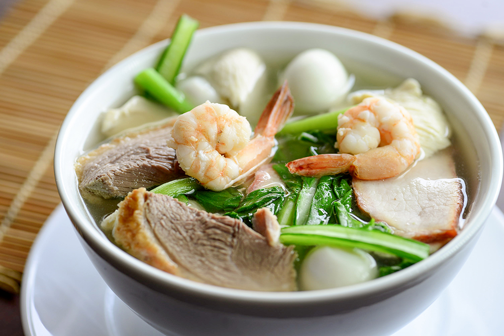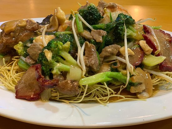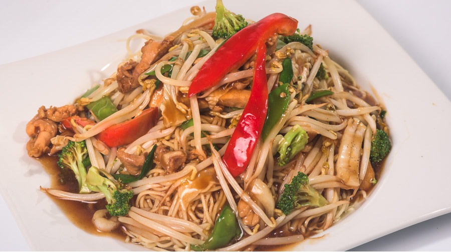 Arroz chaufa, tallarín saltado, frejol chino, pimiento, chancho, pollo y langostinos.