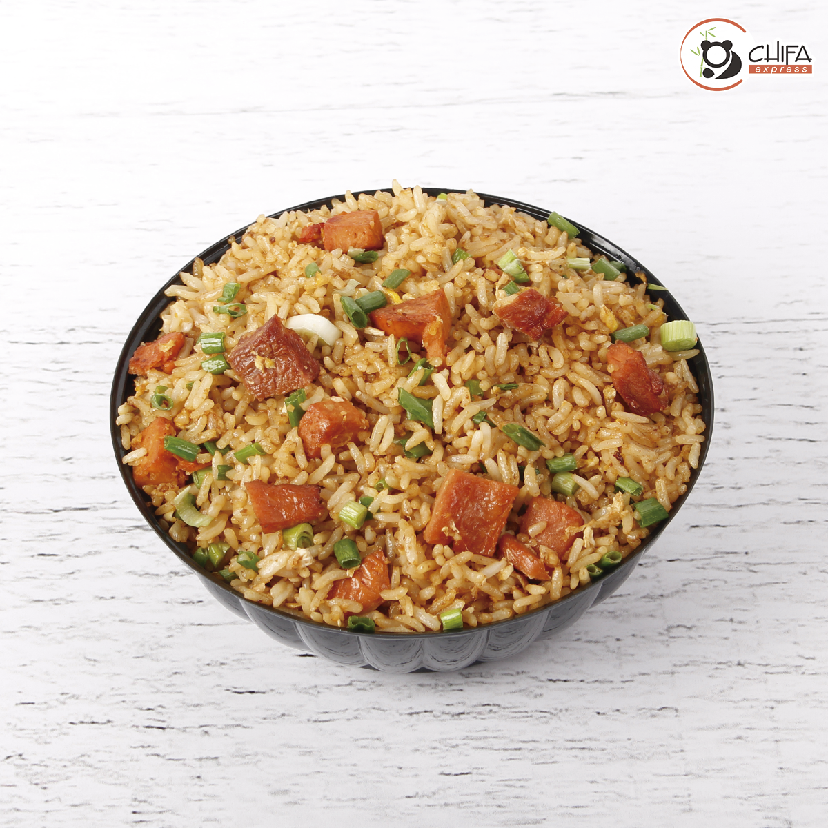 Arroz frito con pequeños trozos de pollo, cerdo, langostino, huevo y cebolla china.