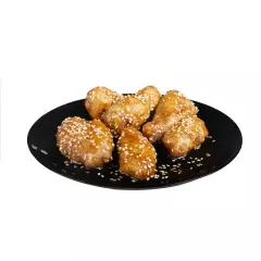 Alitas de pollo fritas, bañadas en salsa de ostión y rociadas con semillas de ajonjoli blanco tostado. (6 und)
