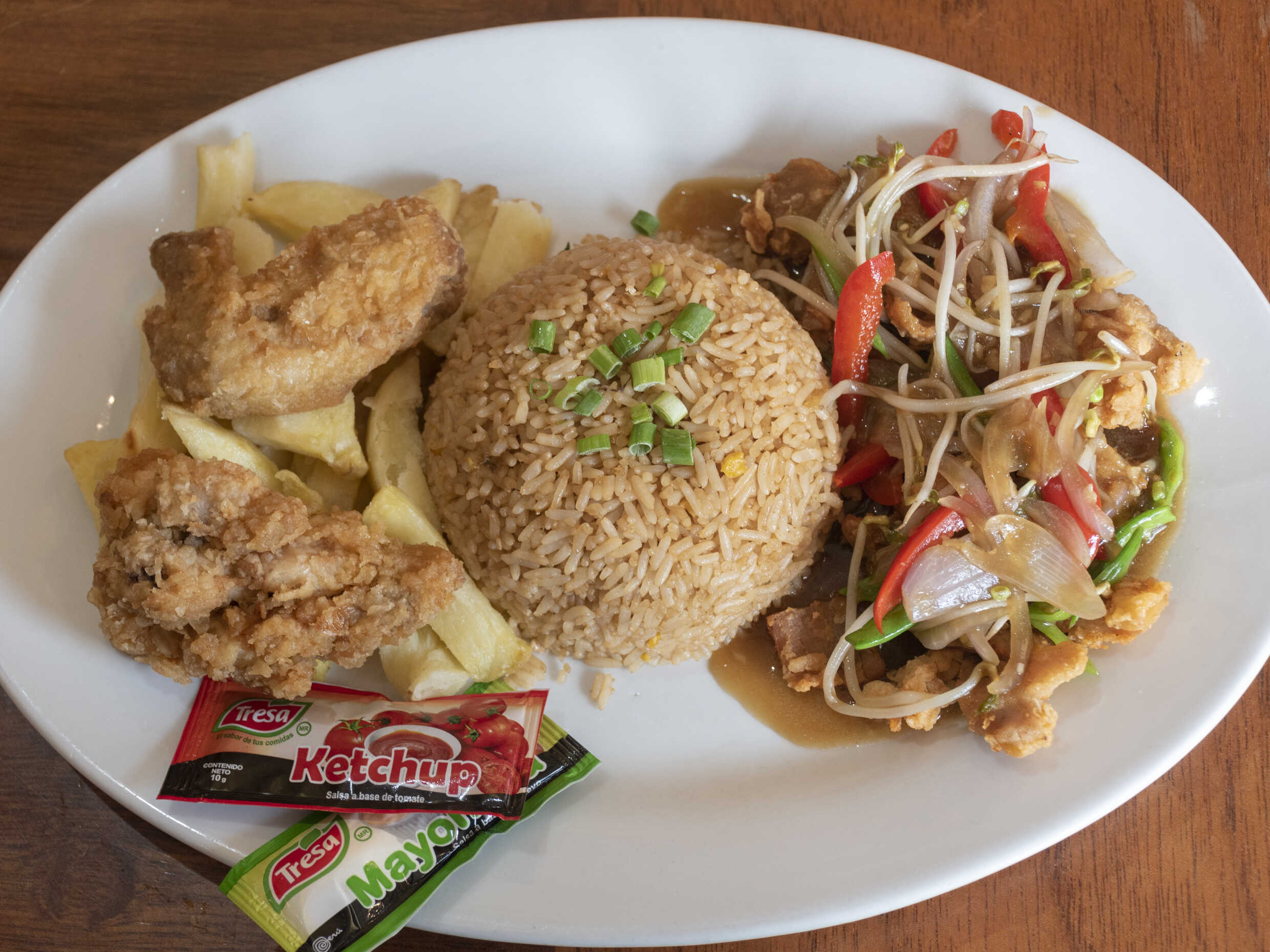 Arroz, tallarín, huevo, pollo, papas, sillao y cebolla china,frejolito