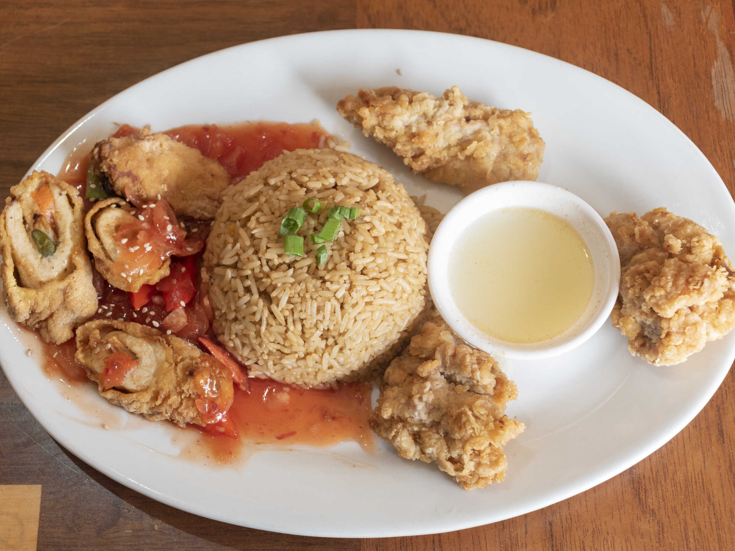 Porción de chaufa, enrollado empanizado con piña, durazno y tamarindo.