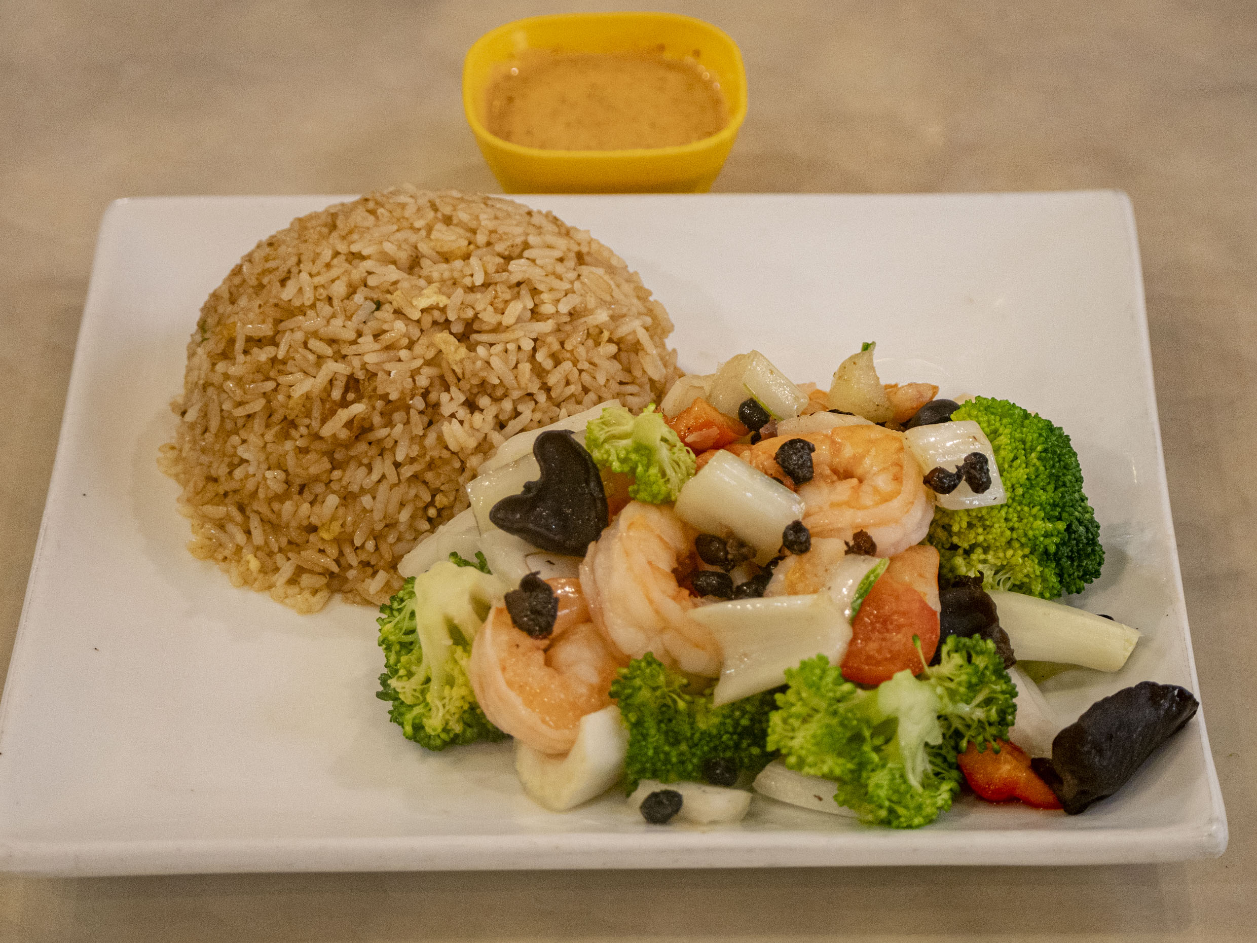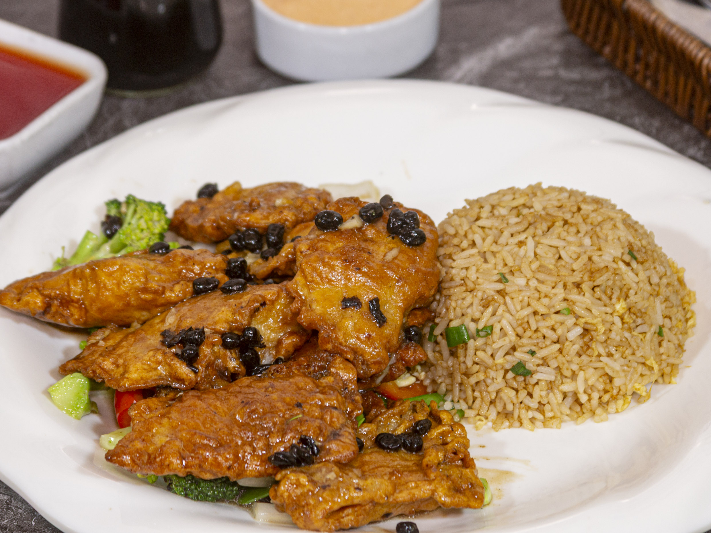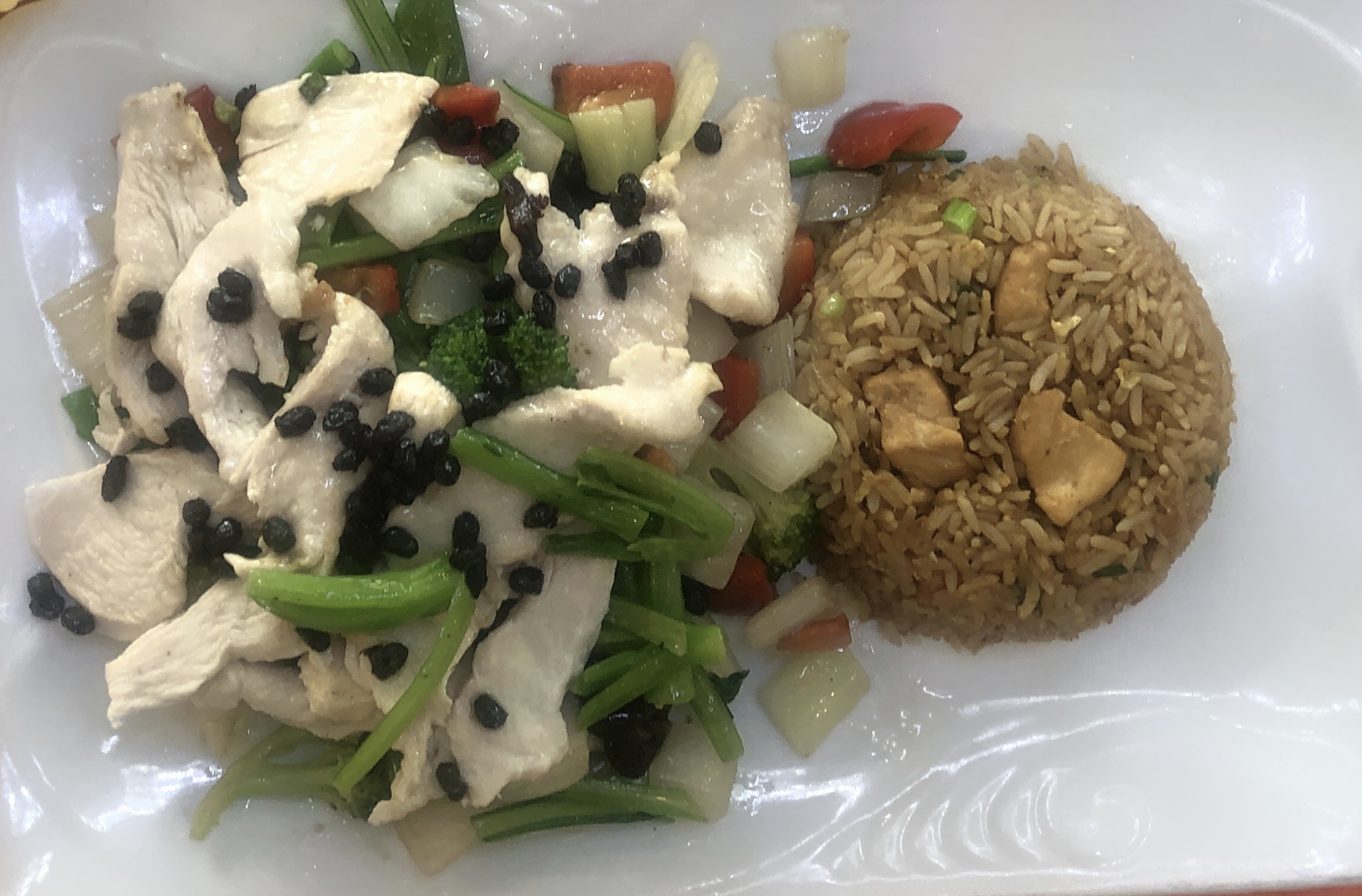 Arroz chaufa, pollo en trozo, tausi y verduras salteadas con salsa ostión.