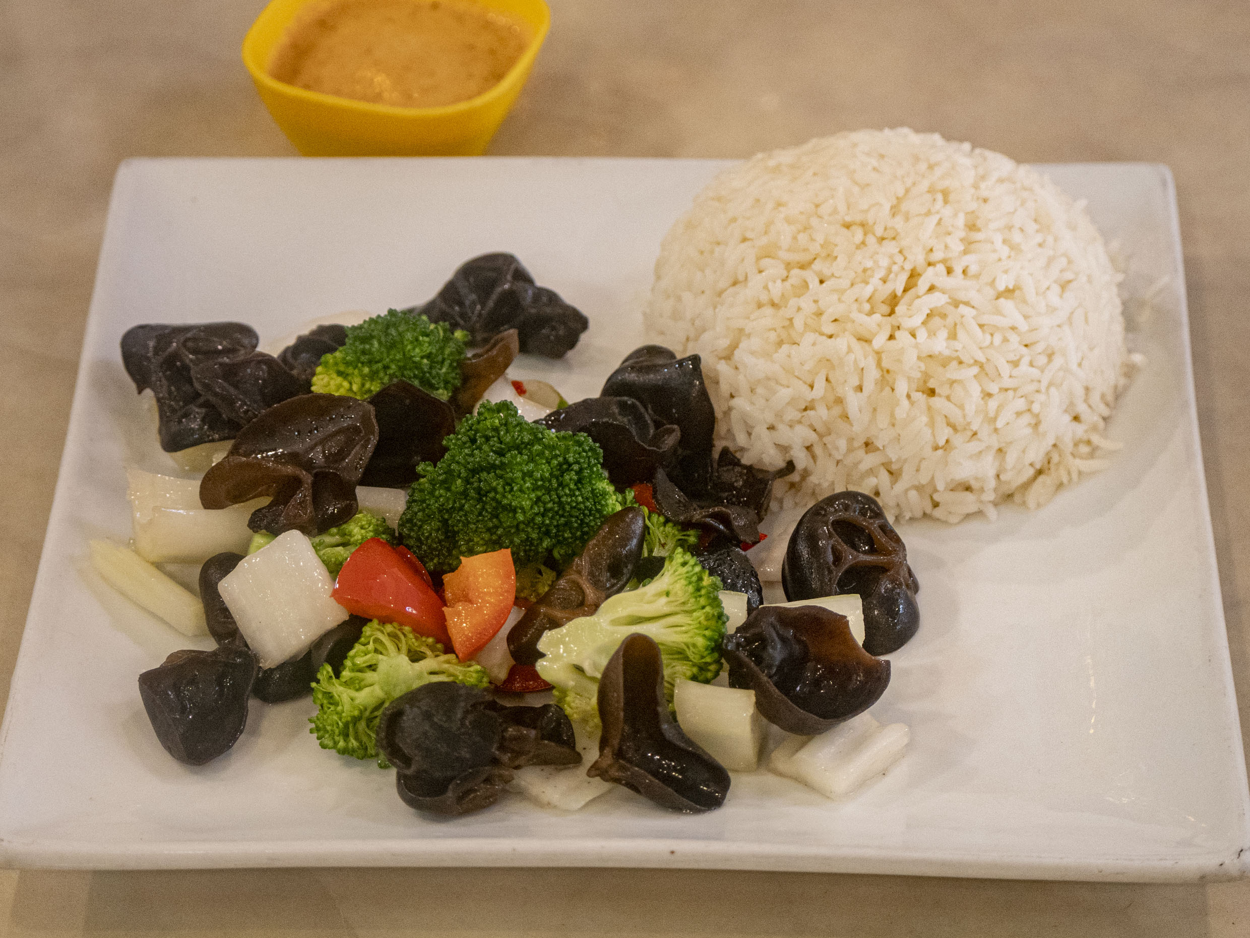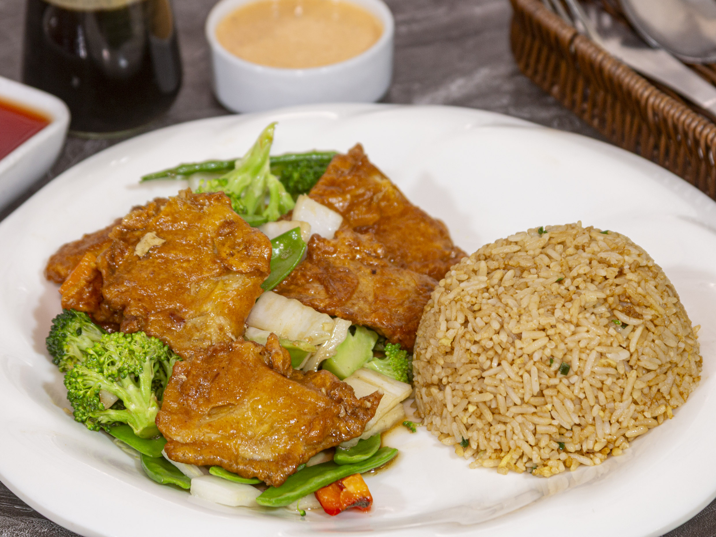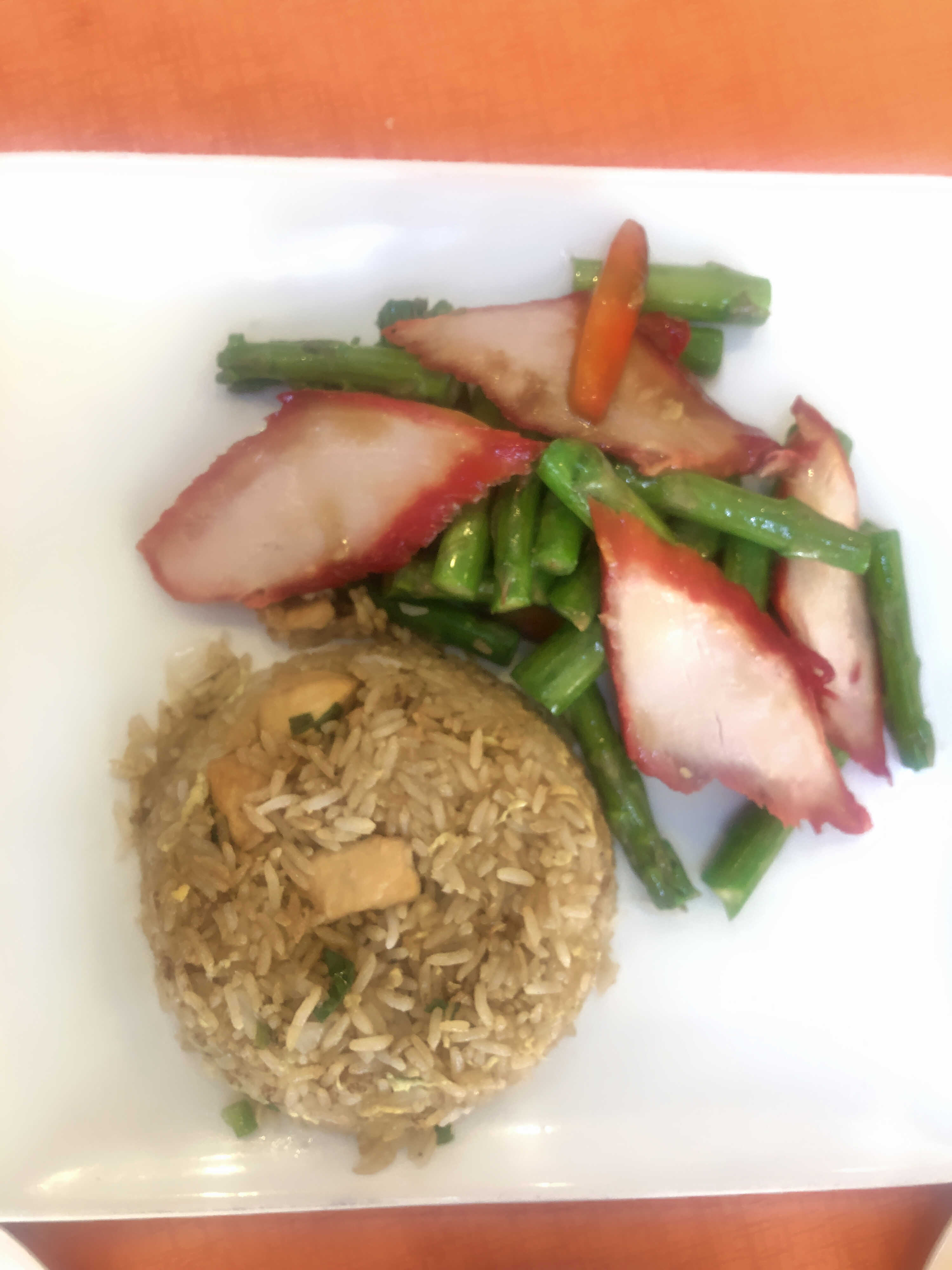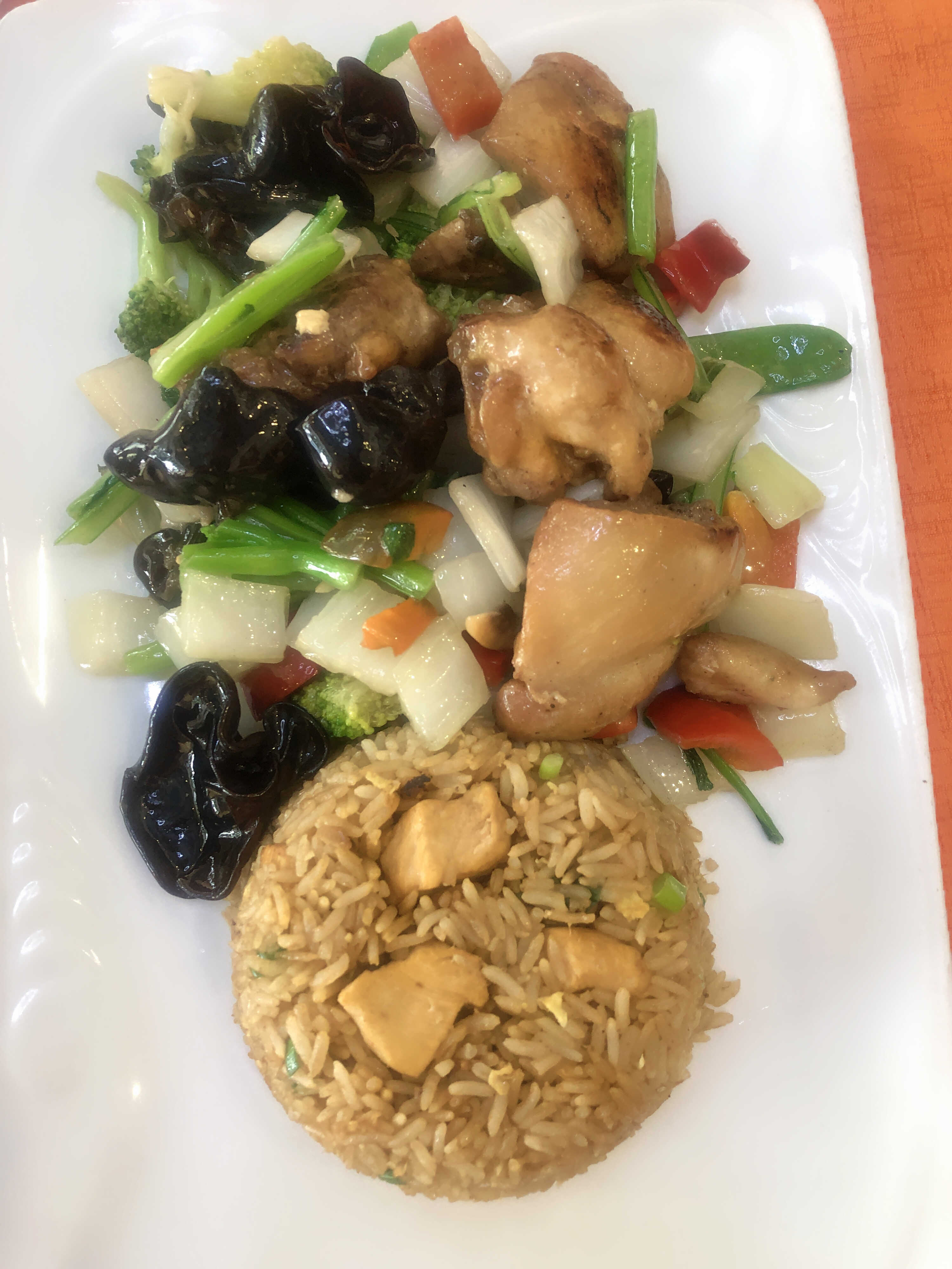 Arroz chaufa, pollo en trozo, tausi y verduras salteadas con salsa ostión.