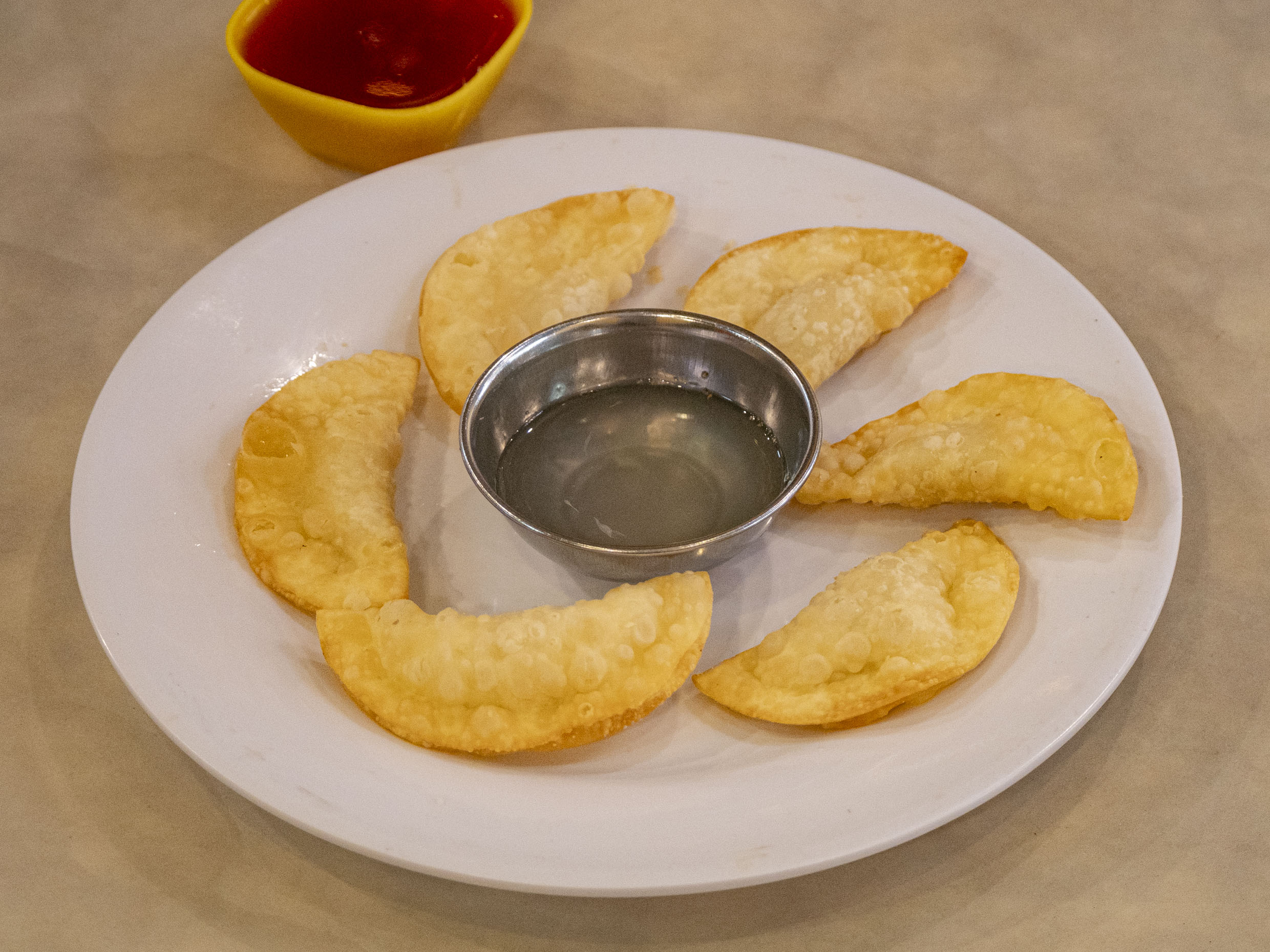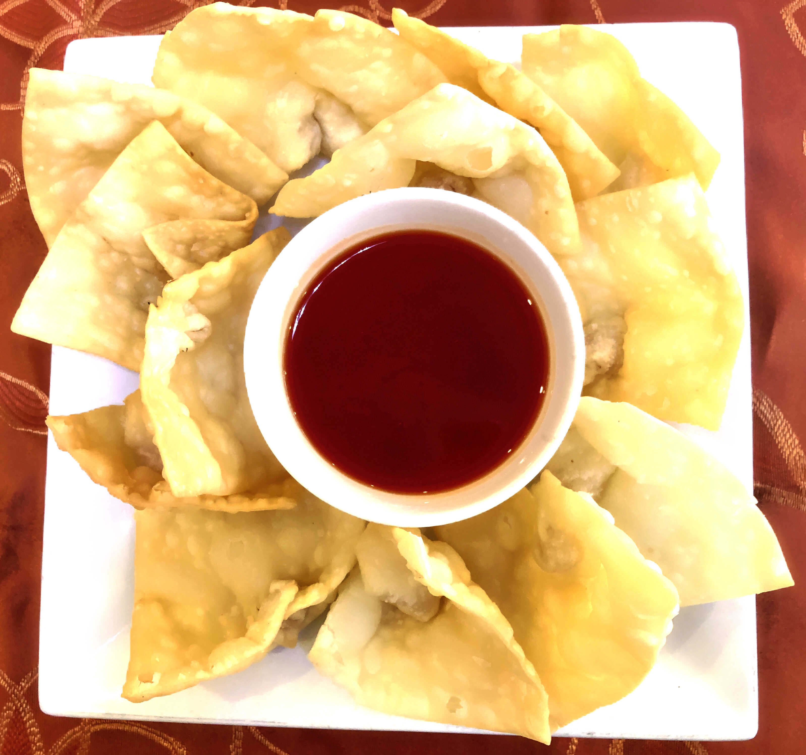 4 Wantanes fritos, 4 sui mai, 4 enrollados de primavera y nabo encurtido.