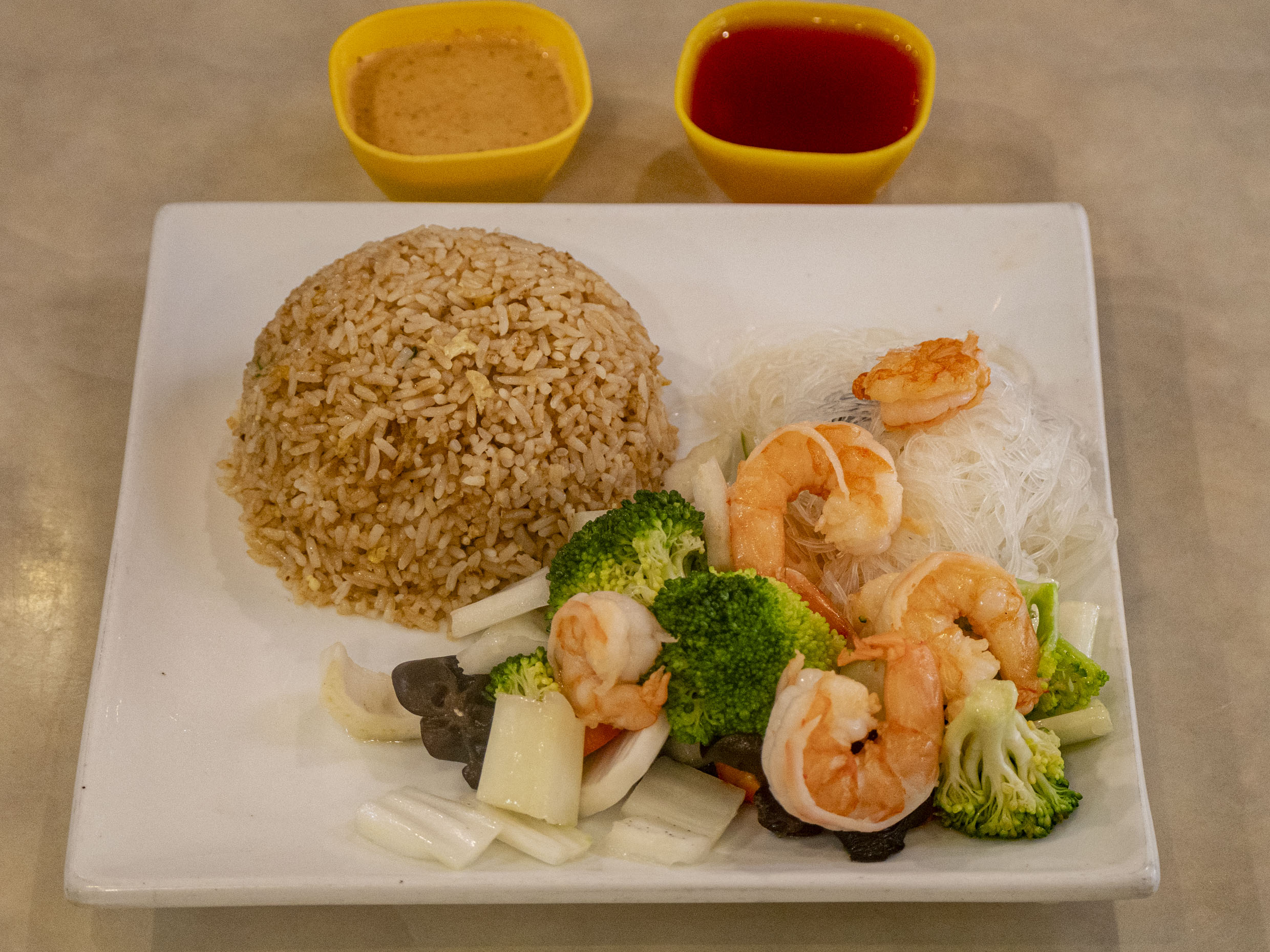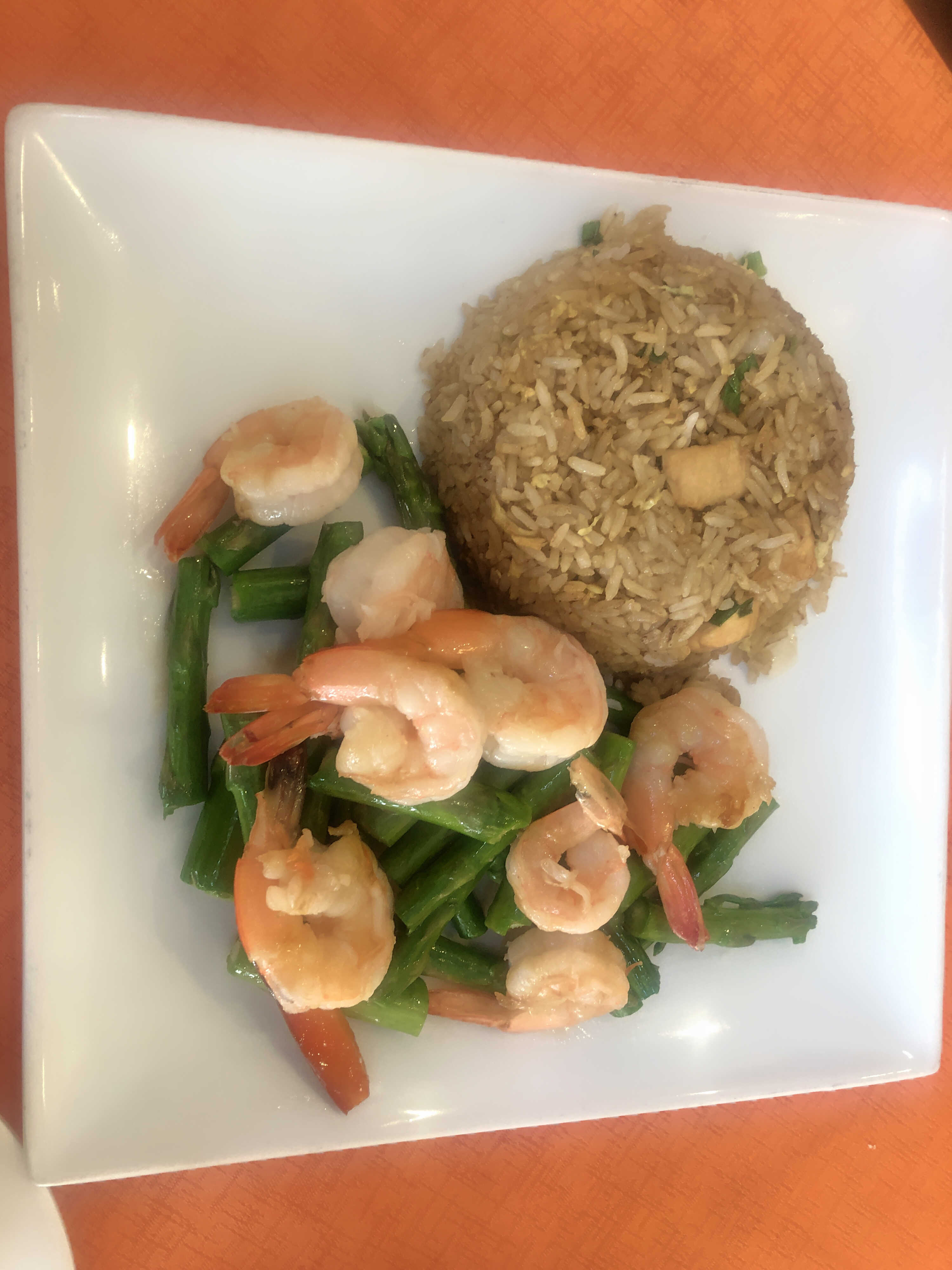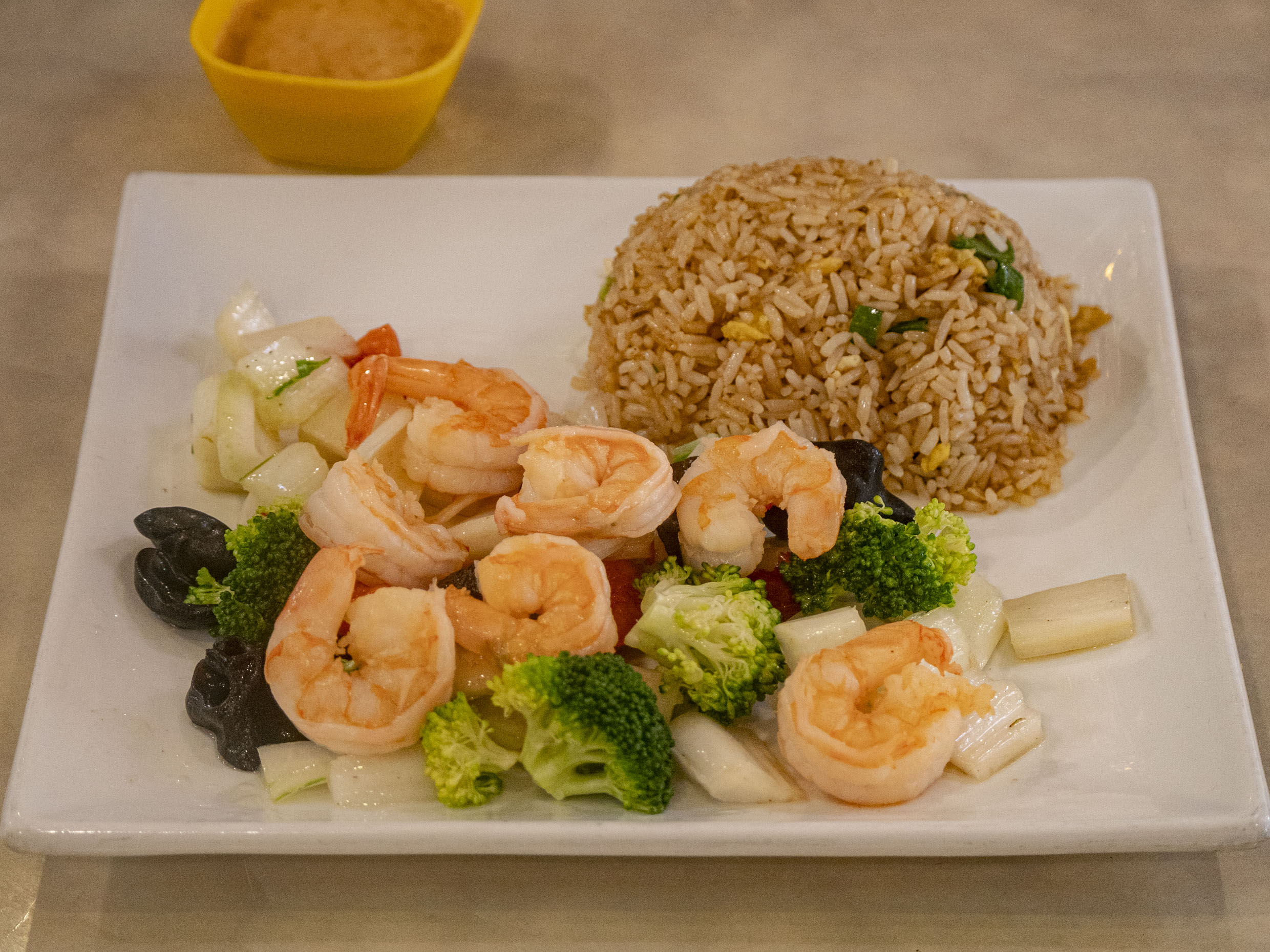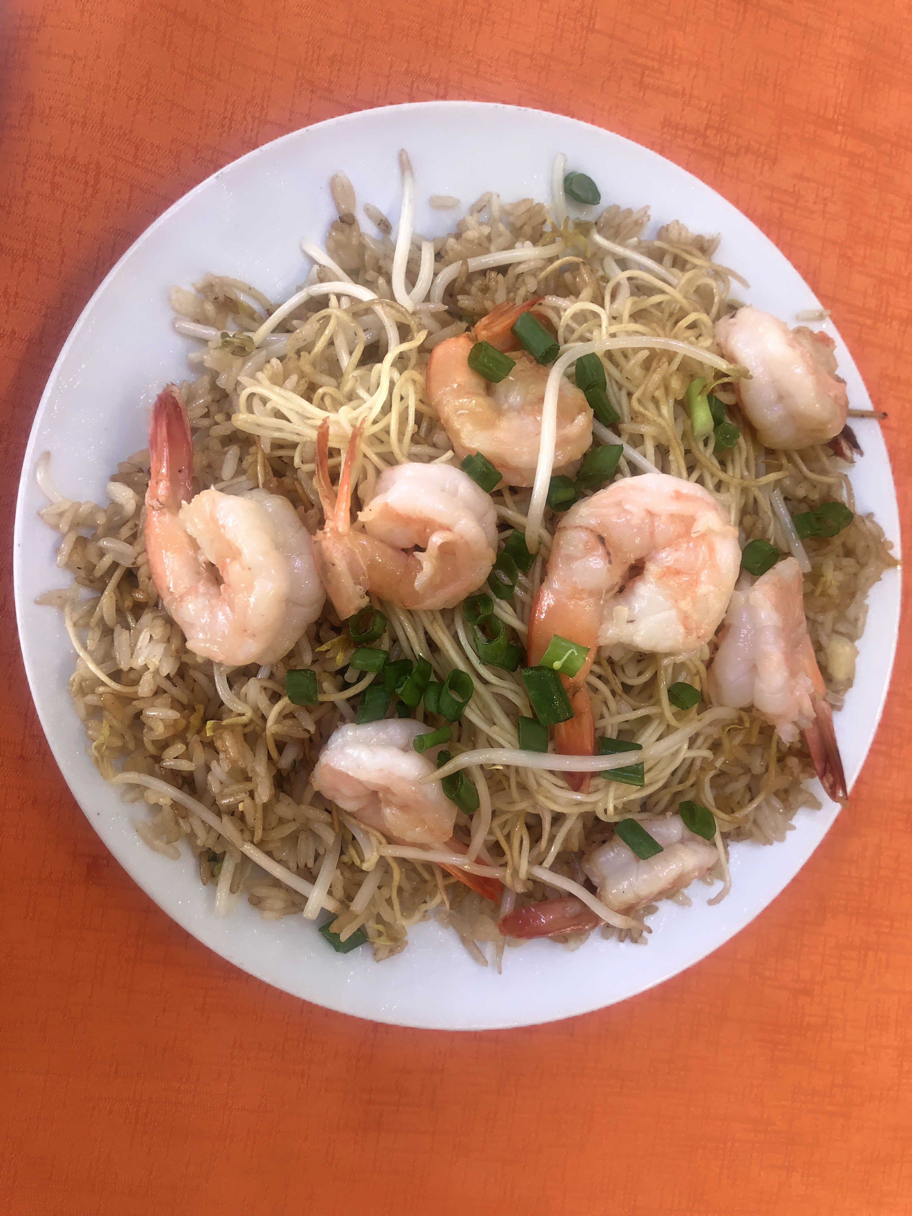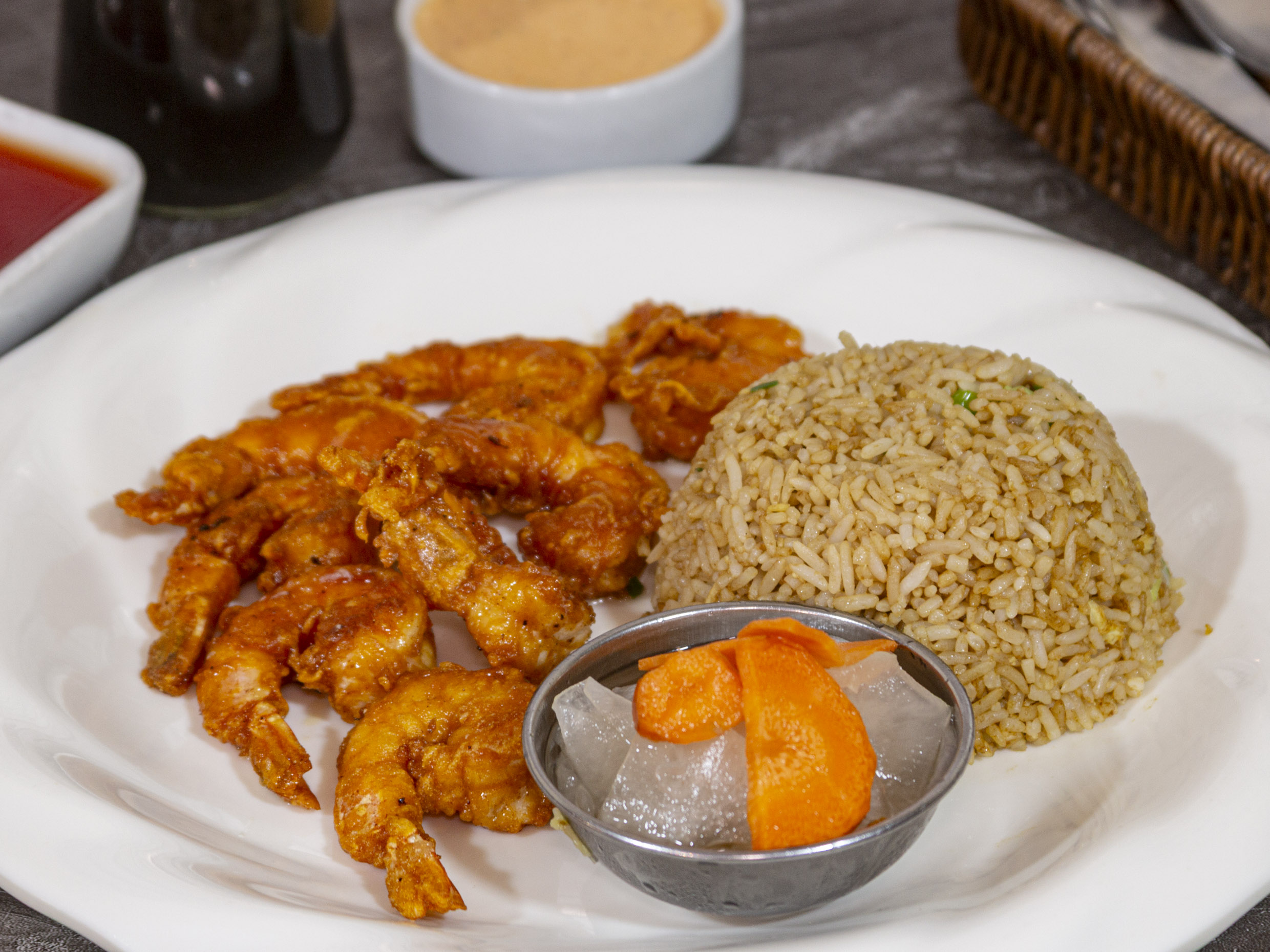 Langostinos, arroz salteado, aceite de ajonjolí, sillao, huevo y cebolla china.