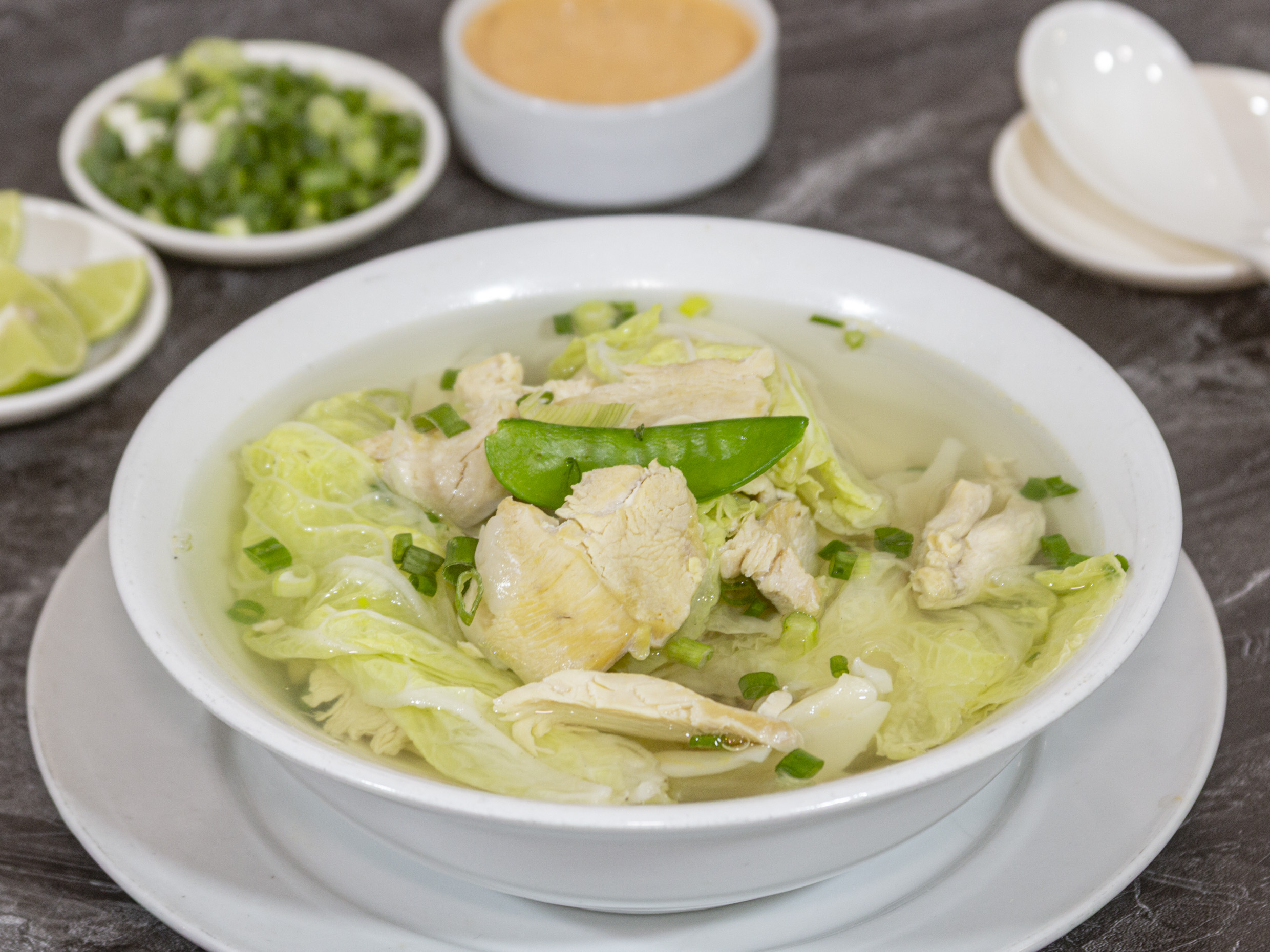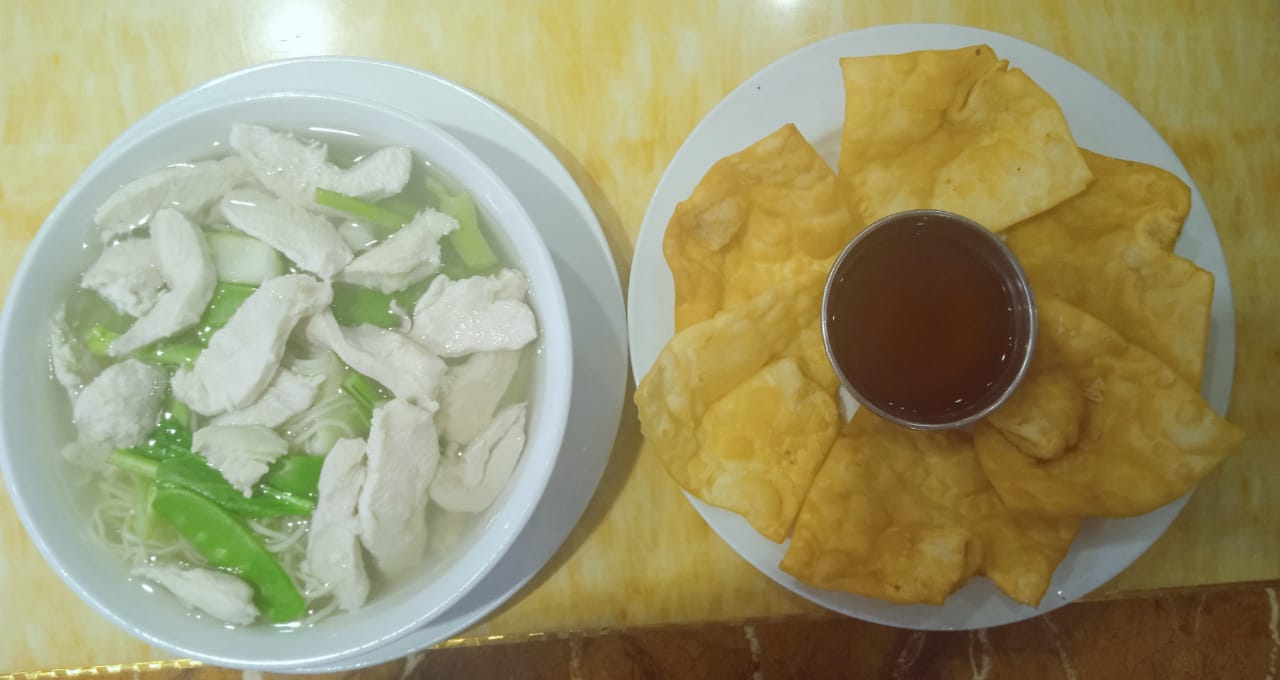 Cortes de col china, pollo, wantán y tallarín decorado con pequeños cortes de cebolla china más sopa de pollo.